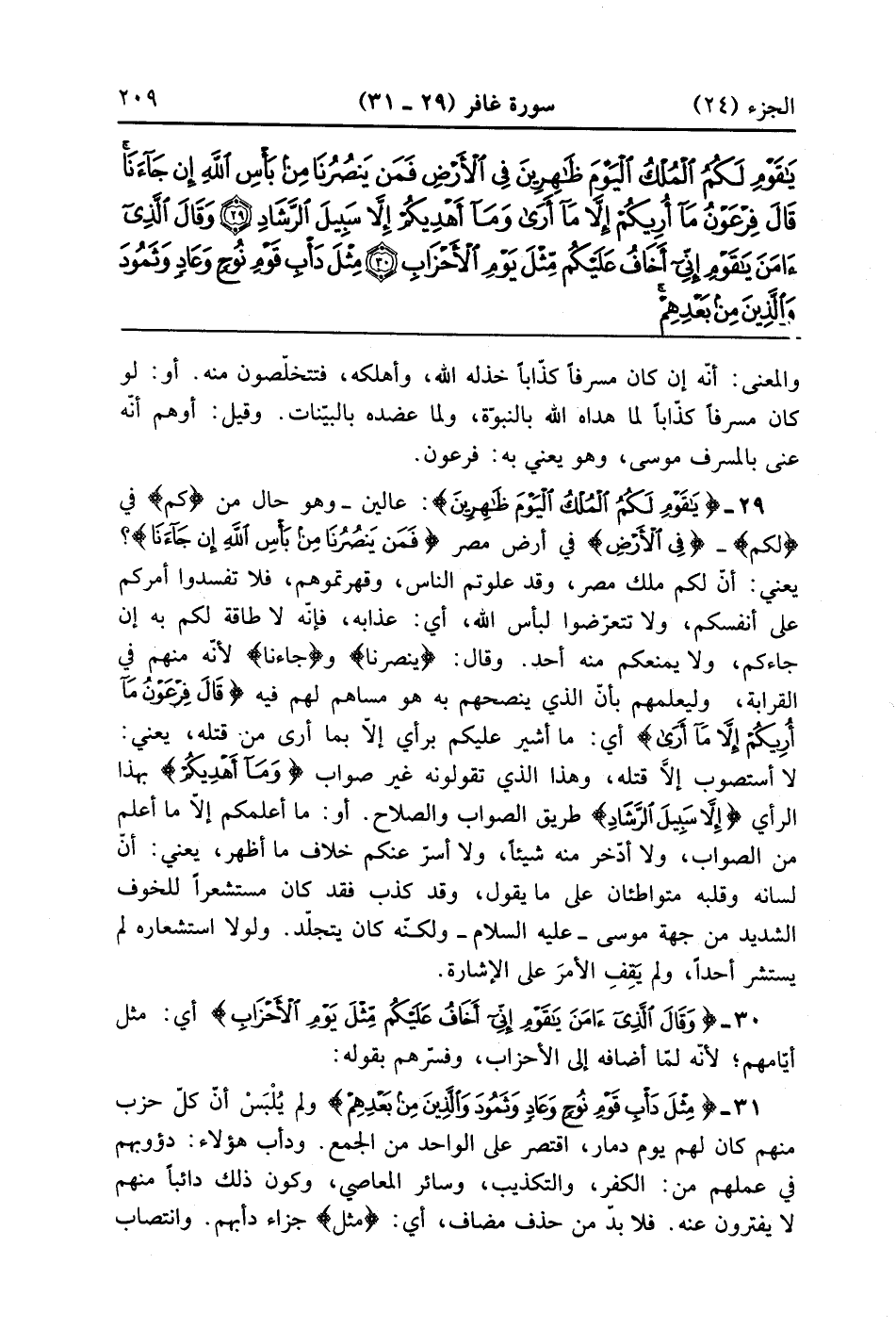 يَا قَوْمِ لَكُمُ الْمُلْكُ الْيَوْمَ ظَاهِرِينَ فِي الْأَرْضِ فَمَنْ يَنْصُرُنَا مِنْ بَأْسِ اللَّهِ إِنْ جَاءَنَا قَالَ فِرْعَوْنُ مَا أُرِيكُمْ إِلَّا مَا أَرَى وَمَا أَهْدِيكُمْ إِلَّا سَبِيلَ الرَّشَادِ (29)