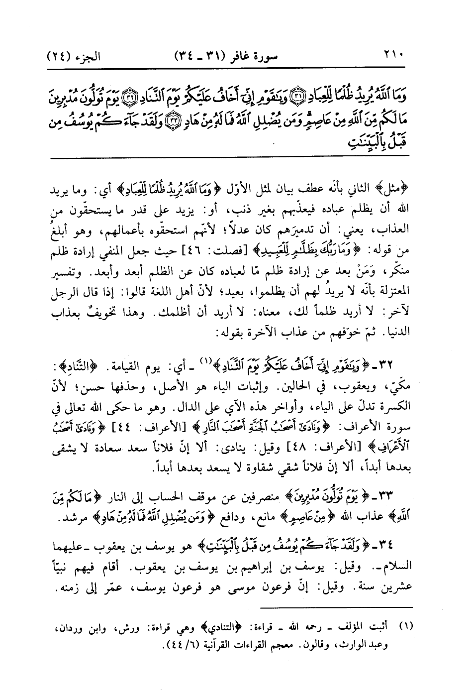 أي يوم القيامة التنادي مكي ويعقوب في الحالين وإثبات الياء هو الأصل وحذفها حسن لأن الكسرة تدل على الياء وآخر هذه الآي على الدال وهو ما حكى الله تعالى في سورة الأعراف وَنَادَى أصحاب الجنة اصحاب النار ونادى اصحاب النار اصحاب الجنة ونادى اصحاب الاعراف وقيل ينادي منادٍ ألا إن فلانا سعد سعادة لا يشقى بعدها أبداً ألا إن فلاناً شقي شقاوة لا يسعد بعدها أبداً