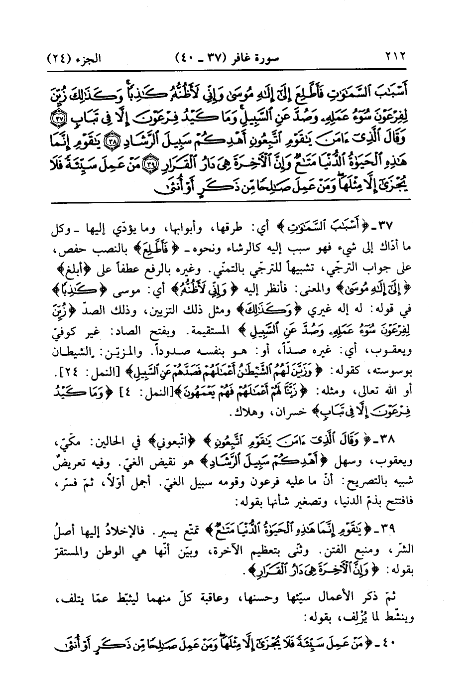 أَسْبَابَ السَّمَاوَاتِ فَأَطَّلِعَ إِلَى إِلَهِ مُوسَى وَإِنِّي لَأَظُنُّهُ كَاذِبًا وَكَذَلِكَ زُيِّنَ لِفِرْعَوْنَ سُوءُ عَمَلِهِ وَصُدَّ عَنِ السَّبِيلِ وَمَا كَيْدُ فِرْعَوْنَ إِلَّا فِي تَبَابٍ (37)