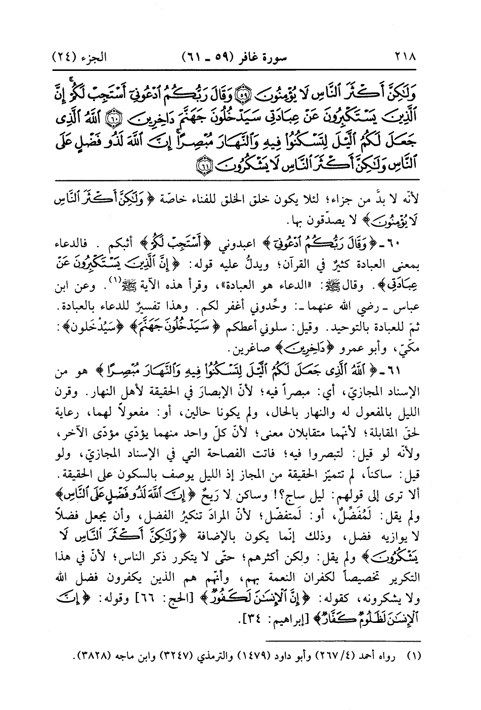 {الله الذي جعل لكم الليل لتسكنوا فيه والنهار مبصرا} وهو من الإسناد المجازي أي مبصراً فيه لأن الابصار في الحقيقة لاهل النهار وقرن الليل بالمفعول له والنهار بالحال ولم يكونا حالين أو مفعولاً لهما رعاية لحق للقابلة لأنهما متقابلان معنى لأن كل واحد منهما يؤدي مؤدى الآخر ولأنه لو قيل لتبصروا فيه فاتت الفصاحة التي في الاسناد المجزى ولو قيل ساكناً لم تتميز الحقيقة من المجاز إذ الليل يوصف بالسكون على الحقيقة ألا ترى إلى قولهم ليل ساجٍ أي ساكن لا ريح فيه {إِنَّ الله لَذُو فَضْلٍ عَلَى الناس} ولم يقل لمفضل أو لمتفضل لأن المراد تنكير الفضل وأن يجعل فضلاً لا يوازيه فضل وذلك إنما يكون بالإضافة {ولكن أَكْثَرَ الناس لاَ يَشْكُرُونَ} ولم يقل ولكن اكثرهم حتى لا يتكرر ذكرالناس لأن في هذا التكرير تخصيصاً لكفران النعمة بهم وأنهم هم الذين يكفرون فضل الله ولا يشكرونه كقوله ان الانسان لكفور وقوله ان الانسان لظلوم كفار