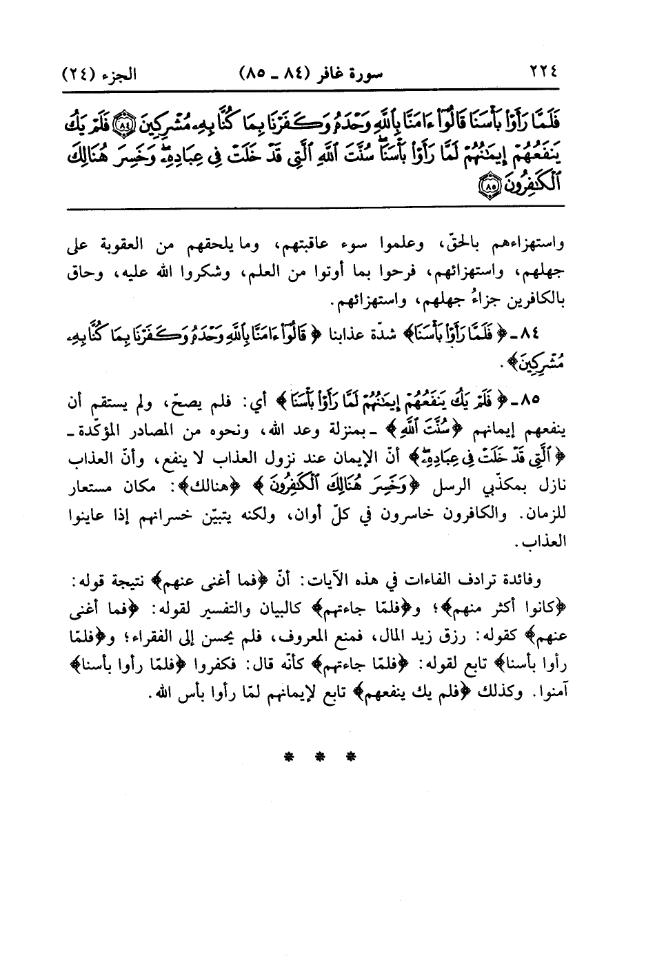 فَلَمْ يَكُ يَنْفَعُهُمْ إِيمَانُهُمْ لَمَّا رَأَوْا بَأْسَنَا سُنَّتَ اللَّهِ الَّتِي قَدْ خَلَتْ فِي عِبَادِهِ وَخَسِرَ هُنَالِكَ الْكَافِرُونَ (85)