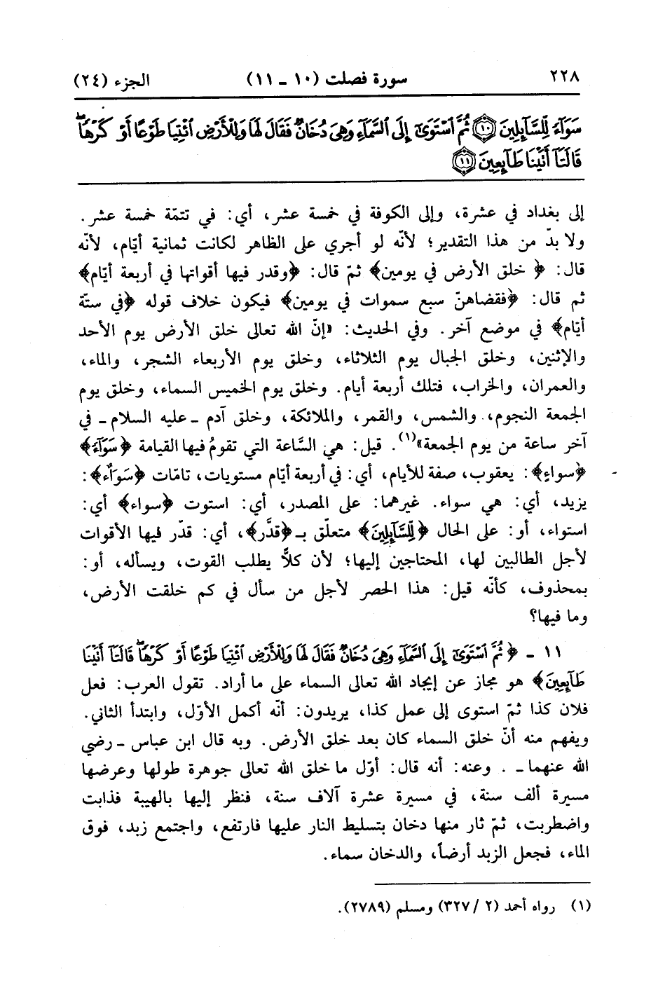إلى بغداد في عشرة وإلى الكوفة في خمسة عشر اى تتمه خمسة ولا بد من هذاالتقدير لأنه لو أجرى على الظاهر لكانت ثمانية أيام لأنه قال خَلَقَ الأرض فِى يَوْمَيْنِ ثم قال واقدر فِيهَا أقواتها فِى أَرْبَعَةِ أَيَّامٍ ثم قال