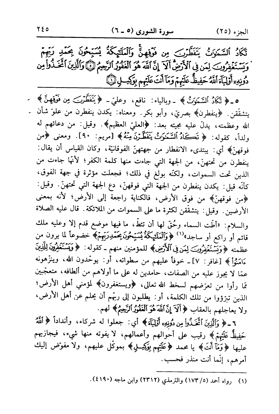 تَكَادُ السَّمَاوَاتُ يَتَفَطَّرْنَ مِنْ فَوْقِهِنَّ وَالْمَلَائِكَةُ يُسَبِّحُونَ بِحَمْدِ رَبِّهِمْ وَيَسْتَغْفِرُونَ لِمَنْ فِي الْأَرْضِ أَلَا إِنَّ اللَّهَ هُوَ الْغَفُورُ الرَّحِيمُ (5)