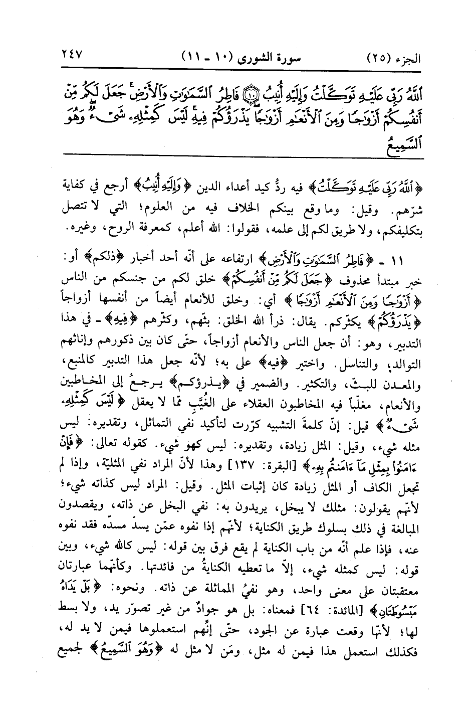 فَاطِرُ السَّمَاوَاتِ وَالْأَرْضِ جَعَلَ لَكُمْ مِنْ أَنْفُسِكُمْ أَزْوَاجًا وَمِنَ الْأَنْعَامِ أَزْوَاجًا يَذْرَؤُكُمْ فِيهِ لَيْسَ كَمِثْلِهِ شَيْءٌ وَهُوَ السَّمِيعُ الْبَصِيرُ (11)