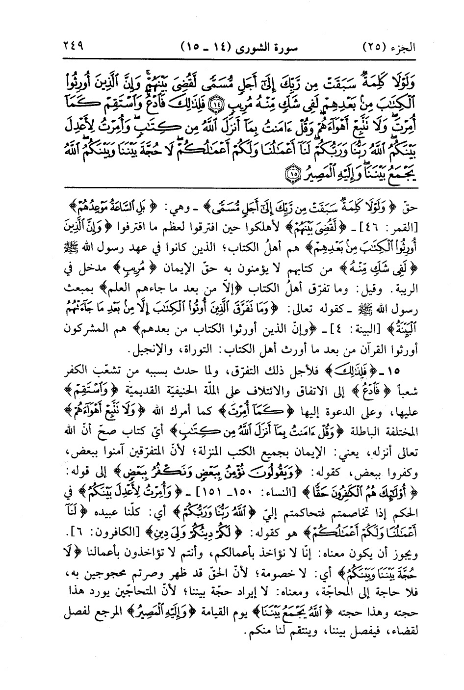 فَلِذَلِكَ فَادْعُ وَاسْتَقِمْ كَمَا أُمِرْتَ وَلَا تَتَّبِعْ أَهْوَاءَهُمْ وَقُلْ آمَنْتُ بِمَا أَنْزَلَ اللَّهُ مِنْ كِتَابٍ وَأُمِرْتُ لِأَعْدِلَ بَيْنَكُمُ اللَّهُ رَبُّنَا وَرَبُّكُمْ لَنَا أَعْمَالُنَا وَلَكُمْ أَعْمَالُكُمْ لَا حُجَّةَ بَيْنَنَا وَبَيْنَكُمُ اللَّهُ يَجْمَعُ بَيْنَنَا وَإِلَيْهِ الْمَصِيرُ (15)