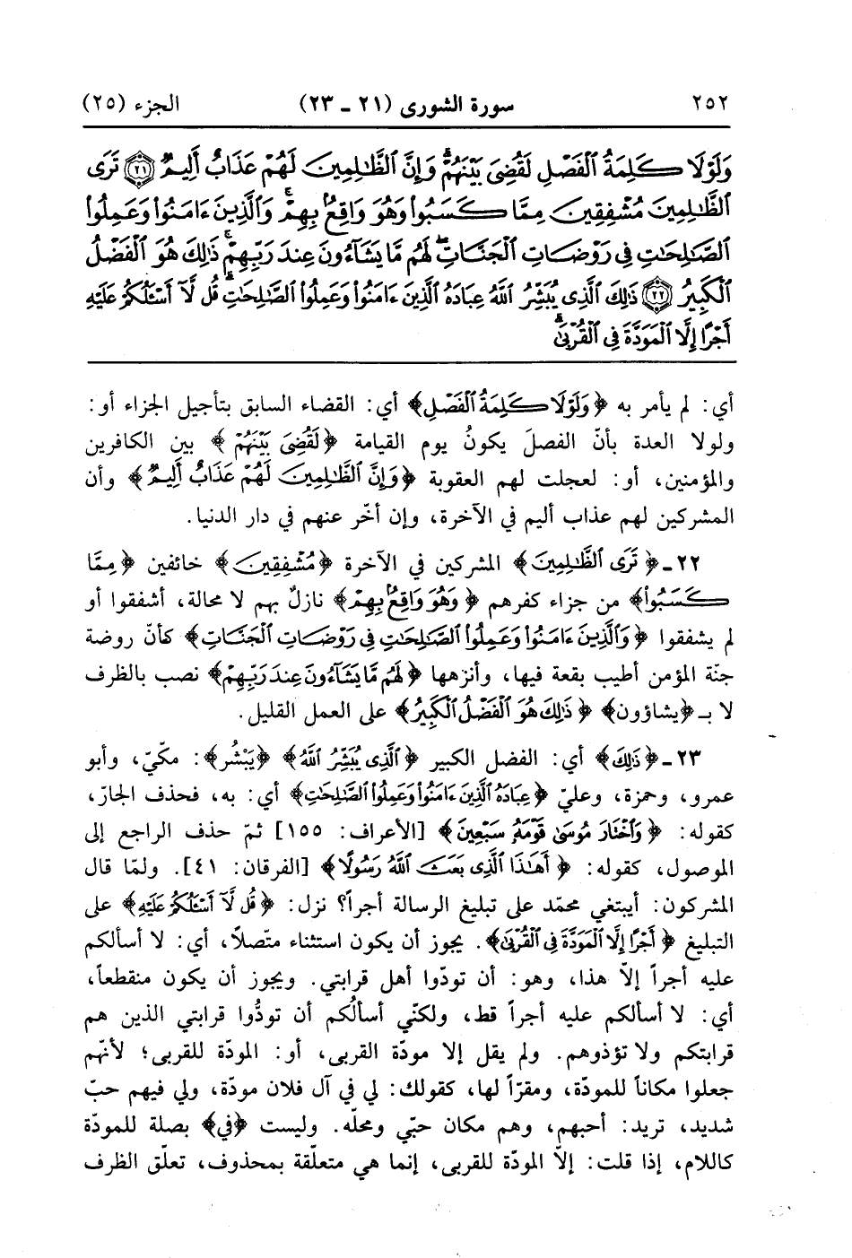 تَرَى الظَّالِمِينَ مُشْفِقِينَ مِمَّا كَسَبُوا وَهُوَ وَاقِعٌ بِهِمْ وَالَّذِينَ آمَنُوا وَعَمِلُوا الصَّالِحَاتِ فِي رَوْضَاتِ الْجَنَّاتِ لَهُمْ مَا يَشَاءُونَ عِنْدَ رَبِّهِمْ ذَلِكَ هُوَ الْفَضْلُ الْكَبِيرُ (22)