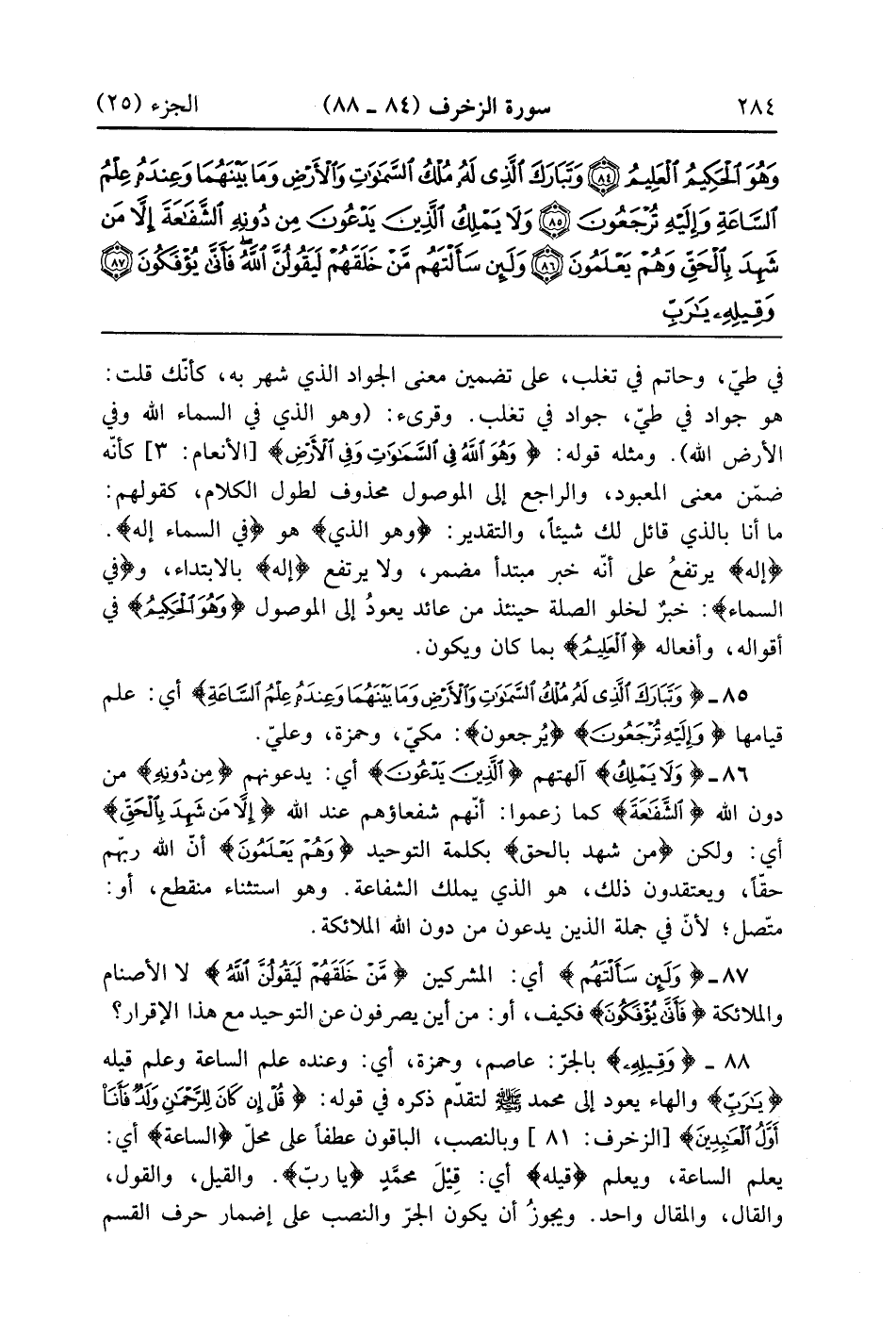 {وَلاَ يَمْلِكُ} آلهتهم {الذين يَدْعُونَ} أي يدعونهم {مِن دُونِهِ} من دون الله {الشفاعة} كما زعمو أنهم شفعاؤهم عند الله {إِلاَّ مَن شَهِدَ بالحق} أي ولكن من شهد بالحق بكلمة التوحيد {وَهُمْ يَعْلَمُونَ} أن الله ربهم حقاً وعتقدون ذلك هو الذي يملك الشفاعة وهو استثناء منقطع