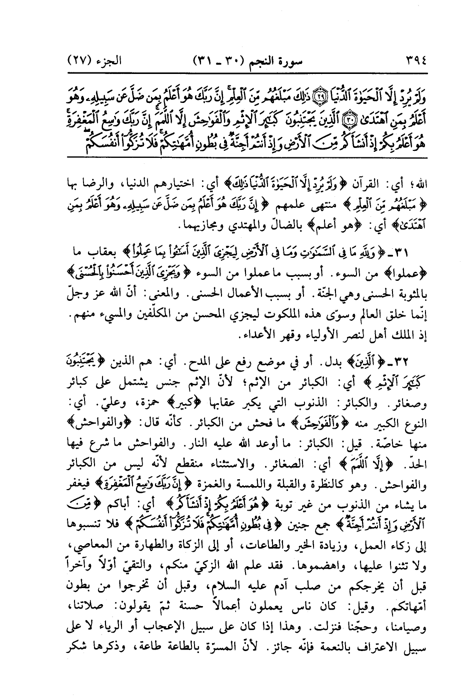 {الذين} بدل اوفى موضع رفع على المدح أي هم الذين {يَجْتَنِبُونَ كبائر الإثم} أي الكبائر من الإثم لان الاثم جنس يشتمل على كبائرر وصغائر والكبائر لاذنوب التي يكبر عقابها كَبِيرٌ حمزة وعلي أي النوع الكبير منه {والفواحش} افحس من الكبائر انه قال والفواحش منها خاصة قيل الكبائر ما اوعد الله عليه النار والفواحس ما شرع فيها الحد {إِلاَّ اللمم} أي الصغائر والاستثناء منقطع لانه ليس من اكبائر والفواحش وهو كالنظرة والقيلة واللمسة والغمزة {إِنَّ رَبَّكَ واسع المغفرة} فيغفر ما شاء من الذنوب من غي توبة {هُوَ أَعْلَمُ بِكُمْ إِذْ أَنشَأَكُمْ} أي أباكم {مّنَ الأرض وَإِذْ أَنتُمْ أَجِنَّةٌ} جمع جنين {فِى بُطُونِ أمهاتكم فَلاَ تُزَكُّواْ أَنفُسَكُمْ} فلا تنسبوها إلى زكاء العمل وزيادة الخير والطاعات أو إلى الزكاة والطهارة من المعاصي ولا تثنوا عليها واهضموها فقد علم الله الزكى منكم والتقى اولا وآخر اقبل أن يخرجكم من صلب آدم عليه السلام وقبل ان تخرجوا منبطون امهاتكم وقيل كان نهاس يعملون أعمالاً حسنة ثم يقولون صلاتنا وصيامنا وحجنا فنزلت وهذا إذا كان على سبيل الاعجاب او الرياء لاعلى سبيل الاعتراف بالنعمة فإنه جائز لأن المسرة بالطاعة طاعة وذكرها شكر