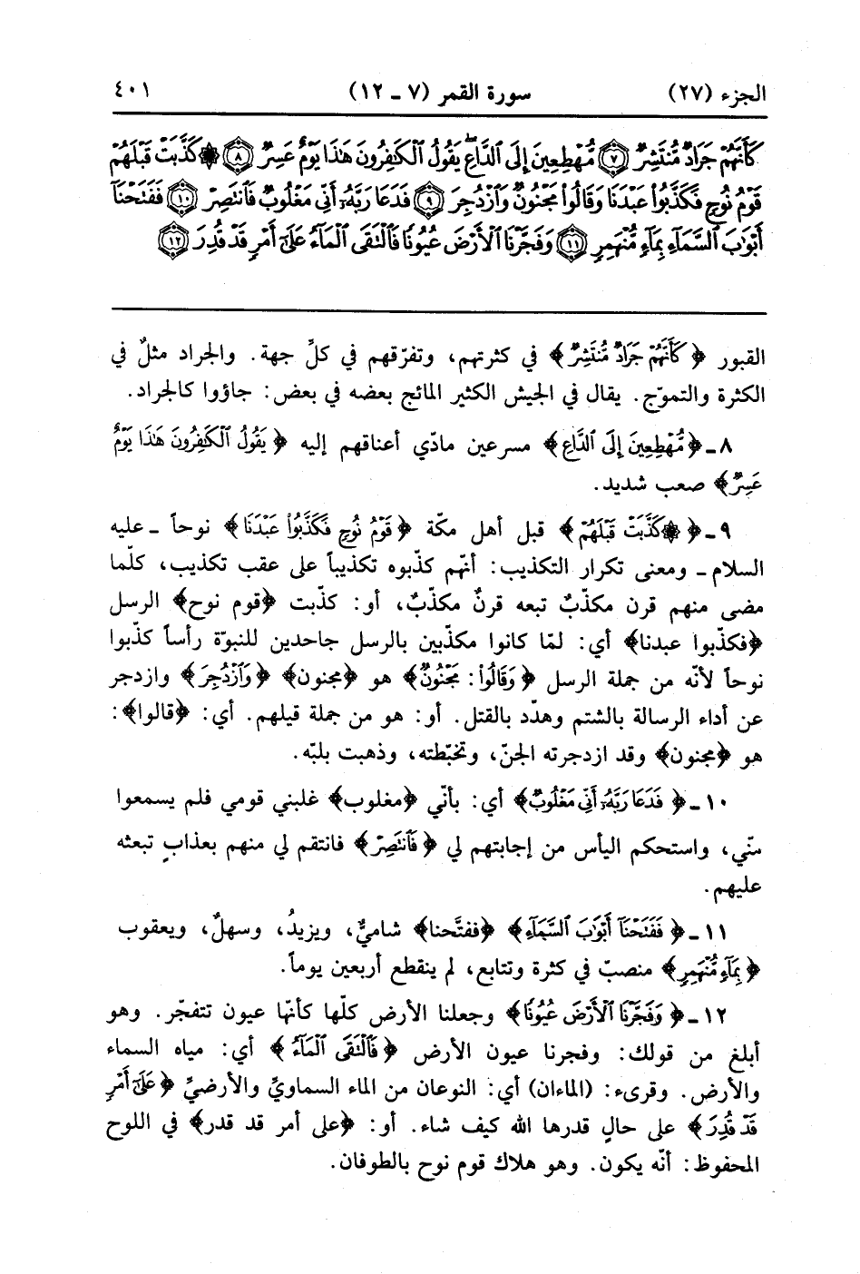 {كَذَّبَتْ قَبْلَهُمْ} قبل أهل مكة {قَوْمُ نُوحٍ فكذبوا عبدنا} نوحا عليه السلام معنى تكرار التكذيب أنهم كذبوه تكذيباً على عقب تكذيب كلما مضى منهم قرن مكذب تبعه قرن مكذب أو كذبت قوم نوح الرسل فكذبوا عبدنا أي لما كانوا مكذبين بالرسل جاحدين للنبوة رأساً كذبوا نوحاً لأنه من جملة الرسل {وَقَالُواْ مَجْنُونٌ} أي هو مجنون {وازدجر} زجر عن أداء الرسالة بالشتم وهدد بالقتل او هو من جملة الرسل {وَقَالُواْ مَجْنُونٌ} أي هو مجنون {وازدجر} الجن وتخبطته وذهب بلبه