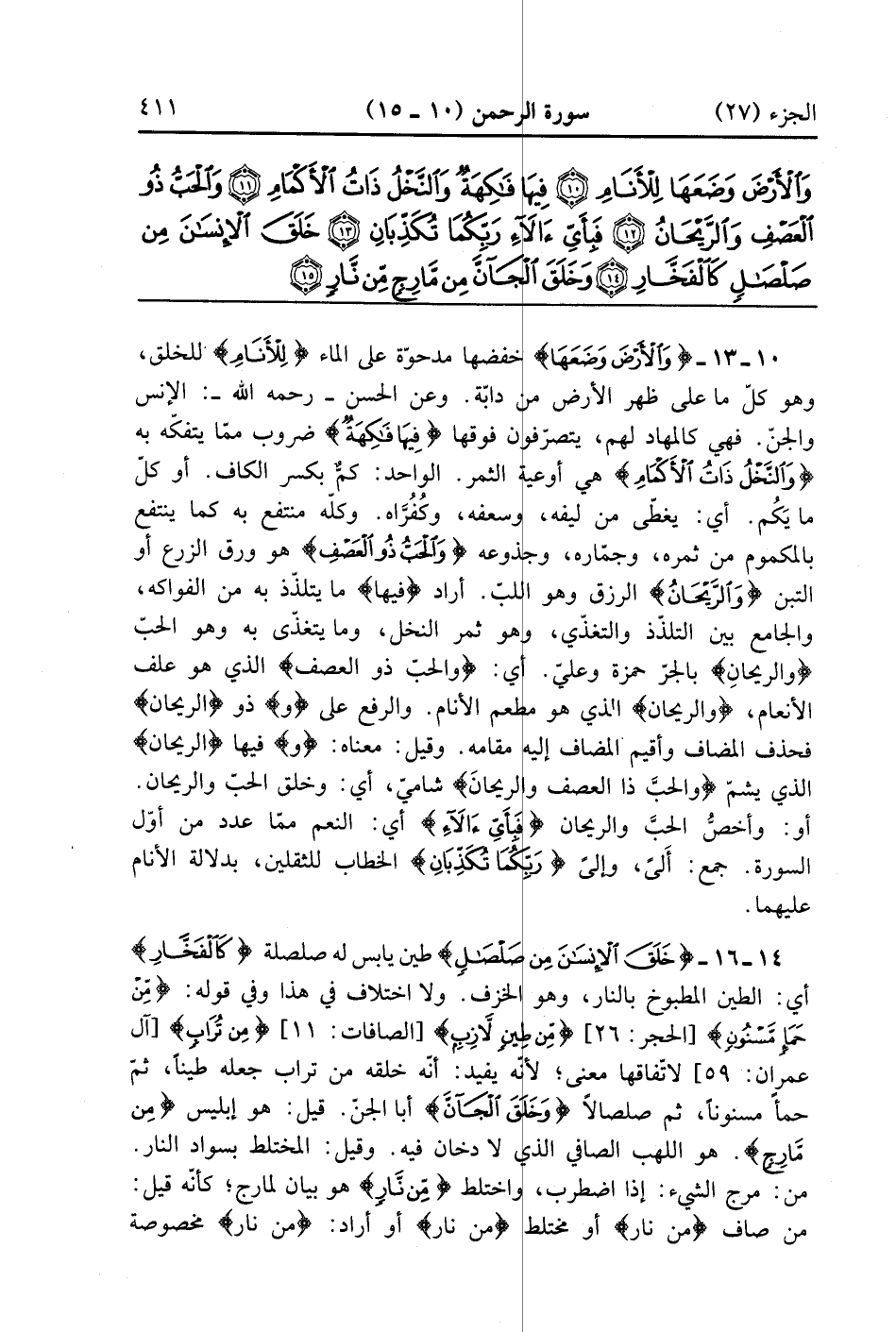 {والريحان} الرزق وهو اللب أراد فيها ما يتلذذ به من الفواكه والجامع بين التلذذ والتغذى وهو تمر النخال وما يتغذى به وهو الحب والريحان بالجر حمزة وعل أي والحب ذو العصف الذي هو علف الأنعام والريحان الذي هو مطعم الأنام والرفع على وذو الريحان فحذف المضاف وأقيم المضاف إليه مقامه وقيل معناه وفيها الريحان الذي يشم والحب ذو العصف والريحان شامي أي وخلق الحب والريحان أو وأخص الحب والريحان