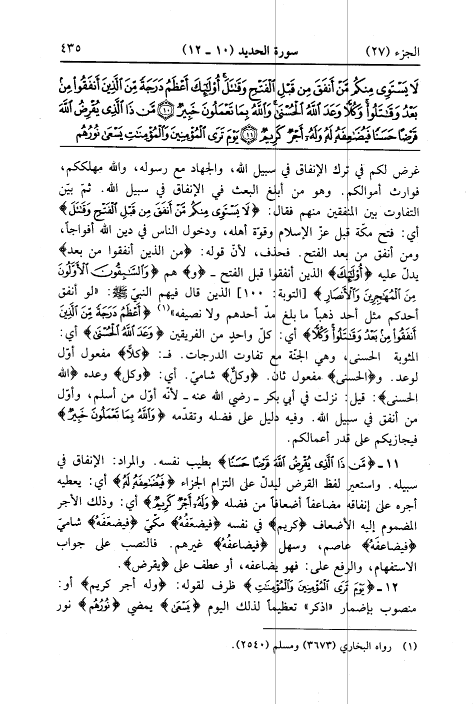 يَوْمَ تَرَى الْمُؤْمِنِينَ وَالْمُؤْمِنَاتِ يَسْعَى نُورُهُمْ بَيْنَ أَيْدِيهِمْ وَبِأَيْمَانِهِمْ بُشْرَاكُمُ الْيَوْمَ جَنَّاتٌ تَجْرِي مِنْ تَحْتِهَا الْأَنْهَارُ خَالِدِينَ فِيهَا ذَلِكَ هُوَ الْفَوْزُ الْعَظِيمُ (12)