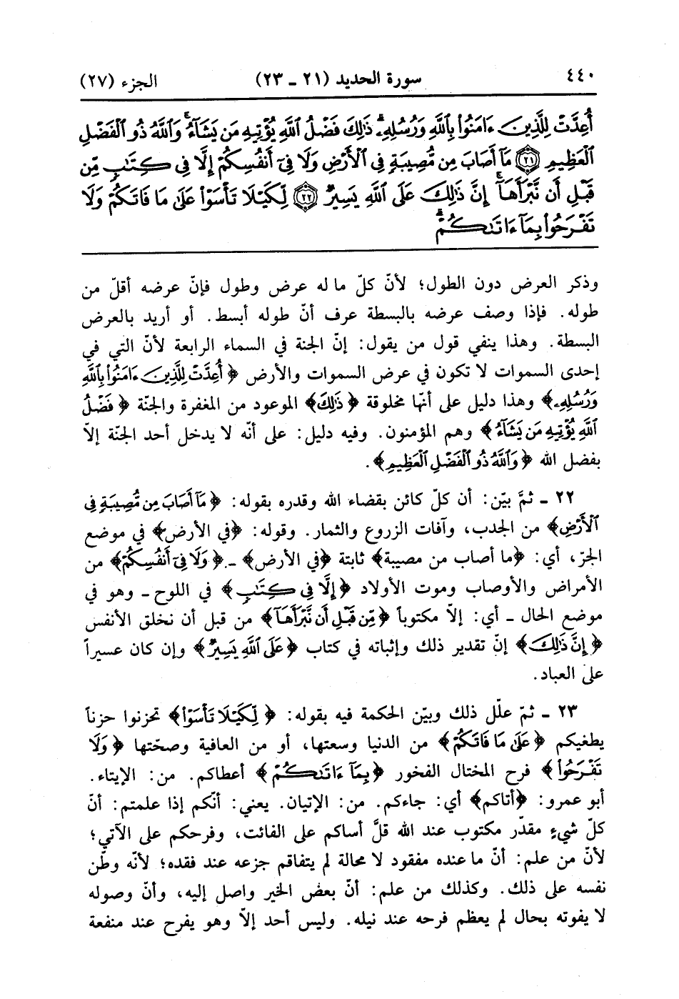 لِكَيْلَا تَأْسَوْا عَلَى مَا فَاتَكُمْ وَلَا تَفْرَحُوا بِمَا آتَاكُمْ وَاللَّهُ لَا يُحِبُّ كُلَّ مُخْتَالٍ فَخُورٍ (23)