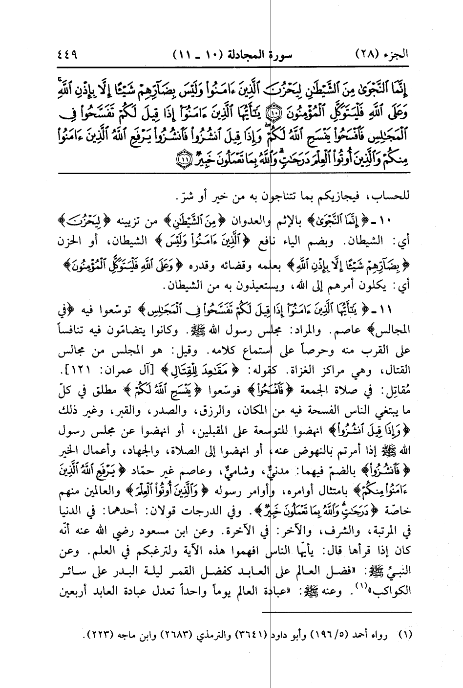 يَا أَيُّهَا الَّذِينَ آمَنُوا إِذَا قِيلَ لَكُمْ تَفَسَّحُوا فِي الْمَجَالِسِ فَافْسَحُوا يَفْسَحِ اللَّهُ لَكُمْ وَإِذَا قِيلَ انْشُزُوا فَانْشُزُوا يَرْفَعِ اللَّهُ الَّذِينَ آمَنُوا مِنْكُمْ وَالَّذِينَ أُوتُوا الْعِلْمَ دَرَجَاتٍ وَاللَّهُ بِمَا تَعْمَلُونَ خَبِيرٌ (11)