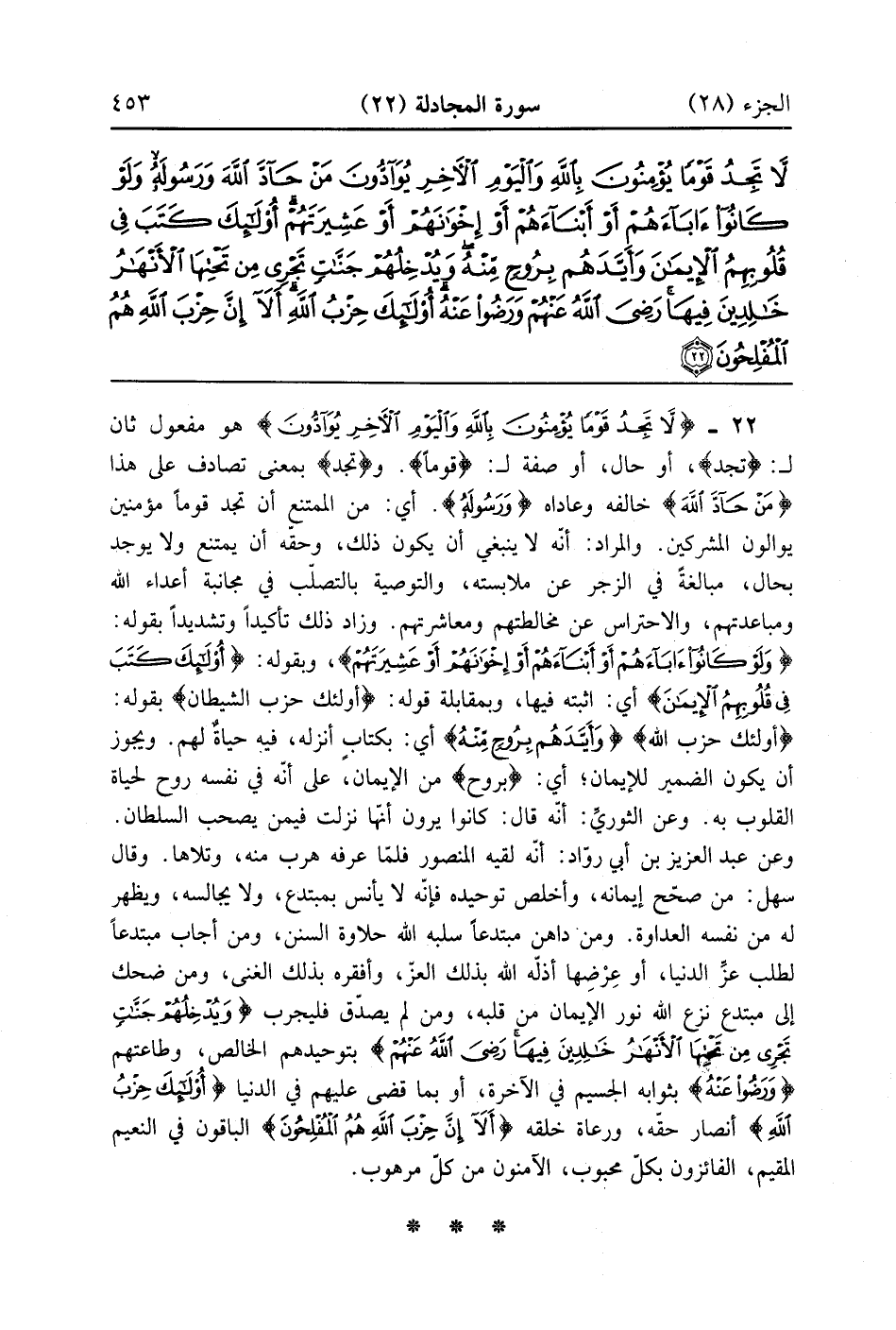 لَا تَجِدُ قَوْمًا يُؤْمِنُونَ بِاللَّهِ وَالْيَوْمِ الْآخِرِ يُوَادُّونَ مَنْ حَادَّ اللَّهَ وَرَسُولَهُ وَلَوْ كَانُوا آبَاءَهُمْ أَوْ أَبْنَاءَهُمْ أَوْ إِخْوَانَهُمْ أَوْ عَشِيرَتَهُمْ أُولَئِكَ كَتَبَ فِي قُلُوبِهِمُ الْإِيمَانَ وَأَيَّدَهُمْ بِرُوحٍ مِنْهُ وَيُدْخِلُهُمْ جَنَّاتٍ تَجْرِي مِنْ تَحْتِهَا الْأَنْهَارُ خَالِدِينَ فِيهَا رَضِيَ اللَّهُ عَنْهُمْ وَرَضُوا عَنْهُ أُولَئِكَ حِزْبُ اللَّهِ أَلَا إِنَّ حِزْبَ اللَّهِ هُمُ الْمُفْلِحُونَ (22)