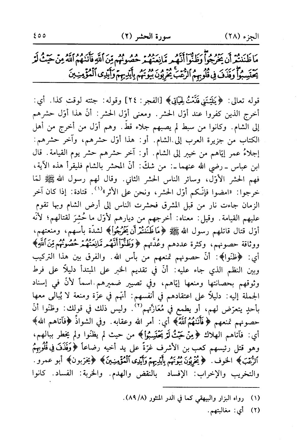 قوله تعالى يا ليتني قدمت لحياتي وقوله جئته لوقت كذا أي أخرج الذين كفروا عند أول الحشر ومعنى أول الحشر أن هذا أول حشرهم إلى الشأم وكانوا من سبط لم يصبهم جلاء قط وهم أول من أخرج من أهل الكتاب من جزيرة العرب إلى الشأم أو هذا أول حشرهم وآخر حشرهم إجلاء عمر إياهم من خيبر إلى الشام وآخر حشرهم حشر يوم القيامة قال ابن عباس رضي الله عنهما من شك أن المحشر بالشأم فليقرأ هذه الآية فهم الحشر الأول وسائر الناس الحشر الثاني وقال لهم رسول الله صلى الله عليه وسلم لما خرجوا امضوا فإنكم أول الحشر ونحن على الأثر قتادة إذا كان آخر الزمان جاءتنار من قبل المشرق فحشرت الناس إلى أرض الشأم وبها تقوم عليهم القيامة وقيل معناه أخرجهم من ديارهم لأول ما حشر لقتالهم لان أول قتال قاتلهم رسول الله صلى الله عليه وسلم {مَا ظَنَنتُمْ أَن يَخْرُجُواْ} لشدة بأسهم ومنعتهم ووثاقة حصونهم وكثرة عددهم وعدتهم {وَظَنُّواْ أَنَّهُمْ مَّانِعَتُهُمْ حُصُونُهُم مّنَ الله} أي ظنوا أن حصونهم تمنعهم من بأس الله والفرق بين هذا التركيب وبين النظم الذي جاء عليه أن في تقديم الخبر على المبتدأ دليلاً على فرط وثوقهم بحصانتها ومنعها إياهم وفي تصيير ضميرهم اسما لأن وإسناد الجملة إليه دليل على اعتقادهم في أنفسهم أنهم في عزة ومنعة لا يبالي معها بأحد يتعرض لهم أو يطمع في مغازلتهم وليس ذلك في قولك وظنوا أن حصونهم تمنعهم {فأتاهم الله} أي أمر الله وعقابه وفي الشواذ فآتاهم الله أي فآتاهم الهلاك {مِنْ حَيْثُ لَمْ يَحْتَسِبُواْ} من حيث لم يظنوا ولم يخطر ببالهم وهو قتل رئيسهم كعب بن الأشرف غرة على بد أخيه رضاعاً {وَقَذَفَ فِى قُلُوبِهِمُ الرعب} الخوف {يُخْرِبُونَ بُيُوتَهُمْ بِأَيْدِيهِمْ وَأَيْدِى المؤمنين} يُخْرِبُونَ أبو عمرو والتخريب والإخراب الإفساد بالنقض والهدم والخَرُبة الفساد وكانوا
