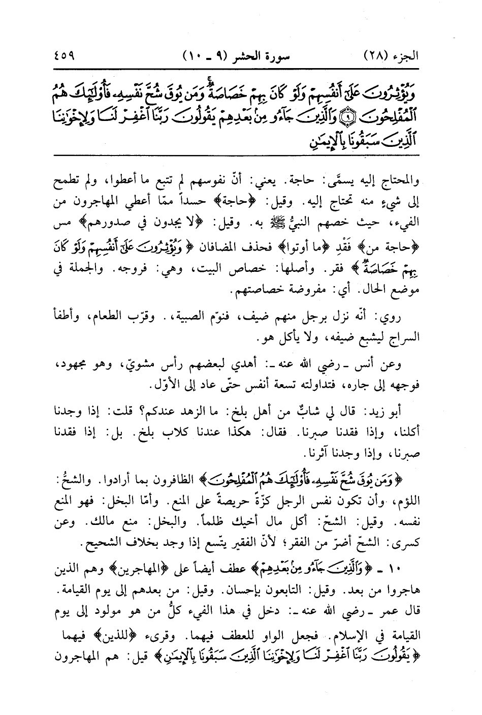 حسداً مما أعطي المهاجرون من الفيء حيث خصهم النبي صلى الله عليه وسلم به وقيل 4 لا يجدون في صدورهم من حاجة من فقد ما أوتوا فحذف المضافان {وَيُؤْثِرُونَ على أَنفُسِهِمْ وَلَوْ كَانَ بِهِمْ خَصَاصَةٌ} فقر وأصلها خصاص البيت وهي فروجه والجملة في موضع الحال أي مفروضة خصاصتهم روي أنه نزل برجل منهم ضيف فنوّم الصبية وقرّب الطعام وأطفأ المصباح ليشبع ضيفه ولا يأكل هو وعن أنس أهدى لبعضهم رأس مشوي وهو مجهود فوجهه إلى جاره فتداولته تسعة أنفس حق عاد إلى الأول أبو زيد قال لي شاب من أهل بلخ با الزهد عندكم قلت إذا وجدنا أكلنا وإذا فقدنا صبرنا فقال هكذا عندنا كلاب بلخ بل إذا فقدنا صبرنا وإذا وجدنا أثارنا {وَمَن يُوقَ شُحَّ نَفْسِهِ فَأُوْلَئِكَ هُمُ المفلحون} الظافرون بما أرادوا والشح أكل اللؤم وأن تكون نفس الرجل كزة حريصة على المنع وأما البخل فهو المنع نفسه وقيل الشح أكل مال أخيك ظلماً والبخل منع مالك وعن كسرى الشح أضر من الفقر لأن الفقير يتسع إذا وجد بخلاف الشحيح