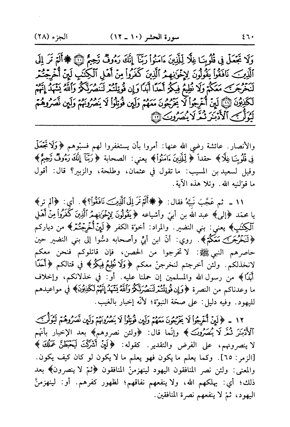 أَلَمْ تَرَ إِلَى الَّذِينَ نَافَقُوا يَقُولُونَ لِإِخْوَانِهِمُ الَّذِينَ كَفَرُوا مِنْ أَهْلِ الْكِتَابِ لَئِنْ أُخْرِجْتُمْ لَنَخْرُجَنَّ مَعَكُمْ وَلَا نُطِيعُ فِيكُمْ أَحَدًا أَبَدًا وَإِنْ قُوتِلْتُمْ لَنَنْصُرَنَّكُمْ وَاللَّهُ يَشْهَدُ إِنَّهُمْ لَكَاذِبُونَ (11)
