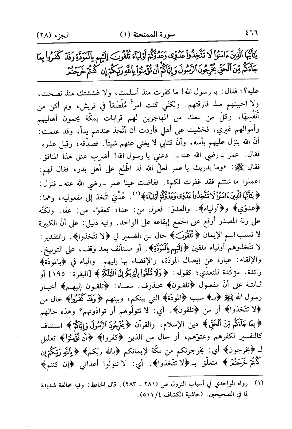 عليه فقال يا رسول الله ما كفرت منذ أسلمت ولا غششتك منذ نصحتك ولا أحببتهم منذ فارقتهم ولكني كنت أمرأ ملصقاً في قريش ولم أكن من أنفسها وكل من معك من المهاجرين لهم قرابات بمكة يحمون أهاليهم وأموالهم غيري فخشيت على أهلي فأردت أن أتخذ عندهم يداً وقد علمت أن الله ينزل عليهم بأسه وأن كتابي لا يغني عنهم شيئا فصدقه وقبل عذره فقال عمر رضي الله عنه دعني يا رسول الله أضرب عنق هذا المنافق فقال صلى الله عليه وسلم ما يدريك يا عمر لعل الله قد اطلع على أهل بدر فقال لهم اعملوا ما شئتم فقد غفرت لكم ففاضت عينا عمر رضي الله عنه فنزل {يا أيها الذين آمنوا لاَ تَتَّخِذُواْ عَدُوّى وَعَدُوَّكُمْ أَوْلِيَاء} عدي اتخذ إلى مفعوليه وهما عدوي وأولياء والعدوّ فعول من عدا كعفوّ من عفا ولكنه على زنة المصدر أوقع على الجمع إيقاعه على الواحد وفيه دليل على أن الكبيرة لا نسلب اسم الإيمان {تُلْقُونَ} حال من الضمير في لا نتخذوا التقدير لا تتخذوهم أولياء ملقين {إِلَيْهِمْ بالمودة} أو متسأنف بعد وقف على التوبيخ والا لقاء عبارة عن إيصال المودة والإفضاء بها إليهم والباء في المودة زائدة مؤكدة للتعدي كقوله وَلاَ تُلْقُواْ بِأَيْدِيكُمْ إلى التهلكة أو ثابتة على أن مفعول تُلْقُونَ محذوف معناه تلقون اليهم اخبار رسول الله صلى الله عليه وسلم بسبب المودة التي بينكم وبينهم {وَقَدْ كَفَرُواْ} حال من لاَ تَتَّخِذُواْ أو من تُلْقُونَ أي لا تتولهم أو توادونهم وهذه حالهم {بِمَا جَاءكُمْ مّنَ الحق} دين الإسلام والقرآن {يُخْرِجُونَ الرسول وإياكم} استئناف كالتفسير لكفرهم وعتوهم أو حال من كفروا {أن تؤمنوا} تعليل ليخرجون أي يخرجونكم من مكة لإيمانكم {بالله رَبّكُمْ إن كنتم خرجتم} متعلق بلا تَتَّخِذُواْ أي لا تتولوا أعدائي إن كنتم