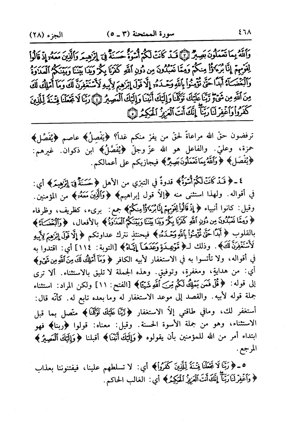 قَدْ كَانَتْ لَكُمْ أُسْوَةٌ حَسَنَةٌ فِي إِبْرَاهِيمَ وَالَّذِينَ مَعَهُ إِذْ قَالُوا لِقَوْمِهِمْ إِنَّا بُرَآءُ مِنْكُمْ وَمِمَّا تَعْبُدُونَ مِنْ دُونِ اللَّهِ كَفَرْنَا بِكُمْ وَبَدَا بَيْنَنَا وَبَيْنَكُمُ الْعَدَاوَةُ وَالْبَغْضَاءُ أَبَدًا حَتَّى تُؤْمِنُوا بِاللَّهِ وَحْدَهُ إِلَّا قَوْلَ إِبْرَاهِيمَ لِأَبِيهِ لَأَسْتَغْفِرَنَّ لَكَ وَمَا أَمْلِكُ لَكَ مِنَ اللَّهِ مِنْ شَيْءٍ رَبَّنَا عَلَيْكَ تَوَكَّلْنَا وَإِلَيْكَ أَنَبْنَا وَإِلَيْكَ الْمَصِيرُ (4)