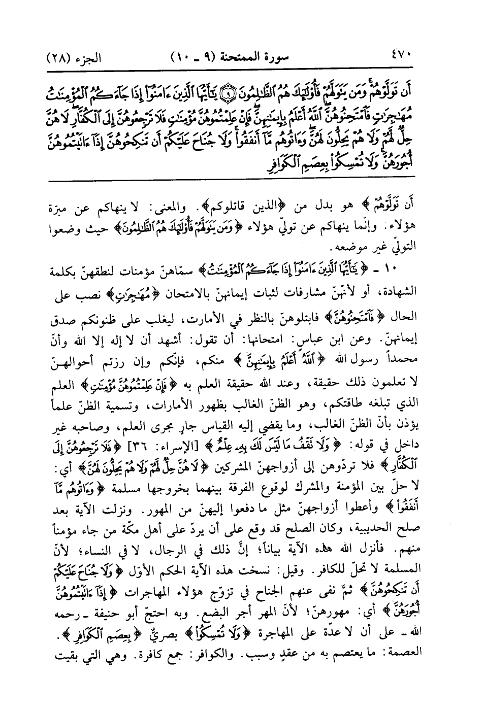 يَا أَيُّهَا الَّذِينَ آمَنُوا إِذَا جَاءَكُمُ الْمُؤْمِنَاتُ مُهَاجِرَاتٍ فَامْتَحِنُوهُنَّ اللَّهُ أَعْلَمُ بِإِيمَانِهِنَّ فَإِنْ عَلِمْتُمُوهُنَّ مُؤْمِنَاتٍ فَلَا تَرْجِعُوهُنَّ إِلَى الْكُفَّارِ لَا هُنَّ حِلٌّ لَهُمْ وَلَا هُمْ يَحِلُّونَ لَهُنَّ وَآتُوهُمْ مَا أَنْفَقُوا وَلَا جُنَاحَ عَلَيْكُمْ أَنْ تَنْكِحُوهُنَّ إِذَا آتَيْتُمُوهُنَّ أُجُورَهُنَّ وَلَا تُمْسِكُوا بِعِصَمِ الْكَوَافِرِ وَاسْأَلُوا مَا أَنْفَقْتُمْ وَلْيَسْأَلُوا مَا أَنْفَقُوا ذَلِكُمْ حُكْمُ اللَّهِ يَحْكُمُ بَيْنَكُمْ وَاللَّهُ عَلِيمٌ حَكِيمٌ (10)