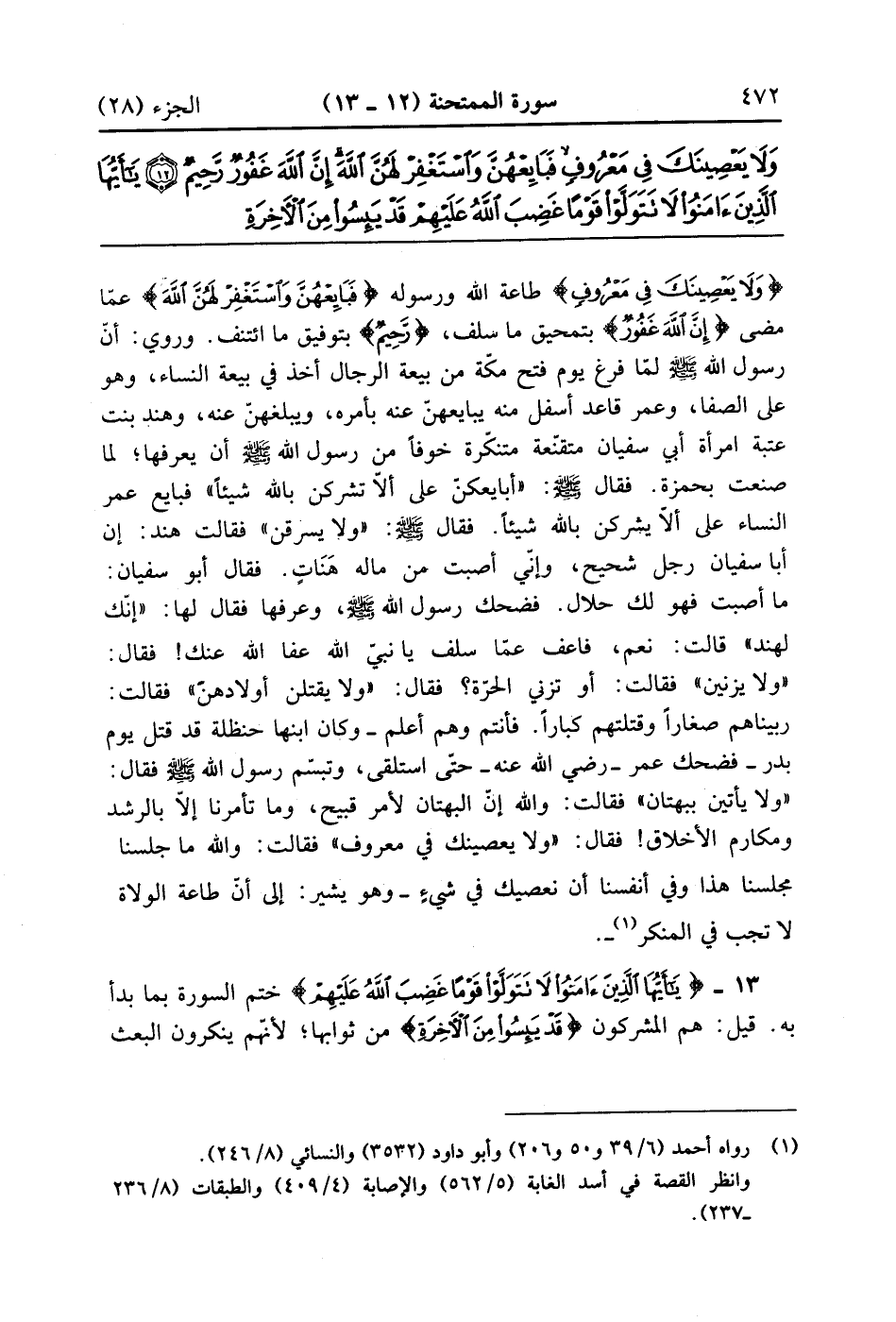 {وَلاَ يَعْصِينَكَ فِى مَعْرُوفٍ} طاعة الله ورسوله {فَبَايِعْهُنَّ واستغفر لَهُنَّ الله} عما مضى {إِنَّ الله غَفُورٌ} بتمحيق ما سلف {رَّحِيمٌ} بتوفيق ما ائتنف وروي أن رسول الله صلى الله عليه وسلم لما فرغ يوم فتح مكة من بيعة الرجال أخذ في بيعة النساء وهو على الصفا وعمر قاعد أسفل منه يبايعهن عنه بأمره ويبلغهن عنه وهند بنت عتبة امرأة أبي سفيان متقنعة متنكرة خوفا من رسول الله صلى الله عليه وسلم أن يعرفها لما صنعت بحمزة فقال عليه السلام أبايعكن على أن لا تشركن بالله شيئاً فبايع عمر النساء على أن لا يشركن بالله شيئاً فقال عليه السلام ولا يسرقن فقالت هند إن أبا سفيان رجل شحيح وإني أصبت من ماله هنات فقال أبو سفيان ما أصبت فهو لك حلال فضحك رسول الله صلى الله عليه وسلم وعرفها فقال لها إنك لهند قالت نعم فاعف عما سلف يا نبي الله عفا الله عنك فقال ولا يزنين فقالت أو تزني الحرة فقال ولا يقتلن أولادهن فقالت ربيناهم صغاراً وقتلتهم كباراً فأنتم وهم أعلم وكان ابنها حنظلة قد قتل يوم بدر فضحك عمر حتى استلقى وتبسم رسول الله صلى الله عليه وسلم فقال ولا يأتين ببهتان فقالت والله إن البهتان لأمر قبيح وما تأمرنا إلا بالرشد ومكارم الأخلاق فقال ولا يعصينك في معروف فقالت والله ما جلسنا مجلسنا هذا وفي أنفسنا أن نعصيك في شيء وهو يشير إلى أن طاعة الولاة لا تجب في المنكر