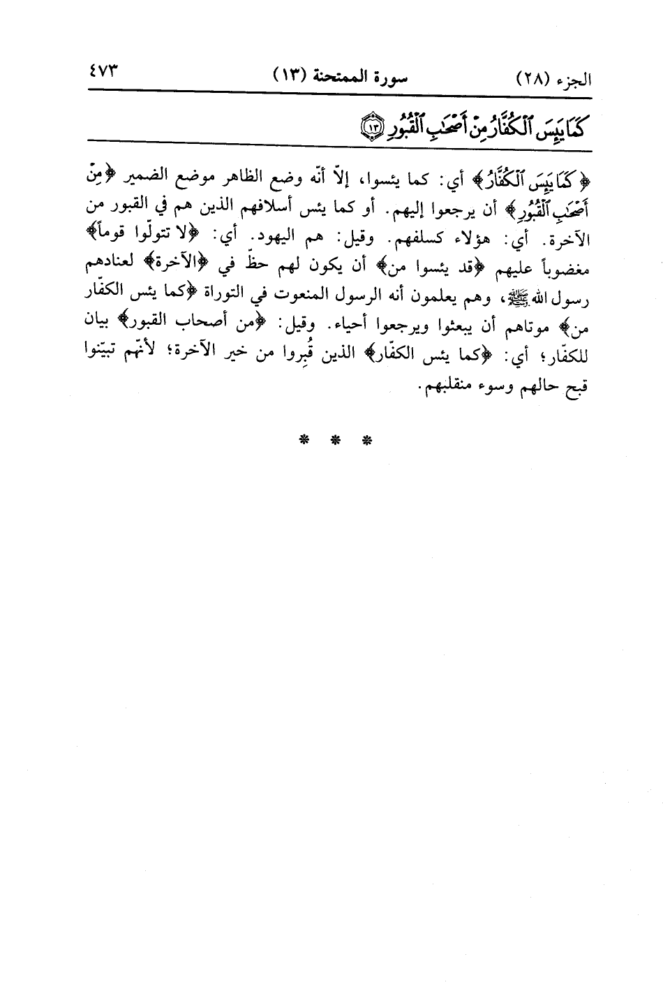 {كَمَا يَئِسَ الكفار} أي يئسوا إلا أنه وضع الظاهر موضع الضمير {من أصحاب القبور} ان يرجعوا اليه أو كما يئس أسلافهم الذين هم في القبور من الآخرة أي هؤلاء كسلفهم وقيل هم اليهود أي لا تتولوا قوماً مغضوباً عليهم قد يئسوا من أن يكون لهم حظ في الآخرة لعنادهم رسول الله صلى الله عليه وسلم وهم يعلمون أنه الرسول في التوراة كما يئس الكفار من موتاهم أن يبعثوا ويرجعوا أحياء وقيل من أصحاب القبور بيان للكفار أي كما يئس الكفار الذين قبروا من خير الآخرة لأنهم تبينوا قبح حالهم وسوء منقلبهم والله اعلم