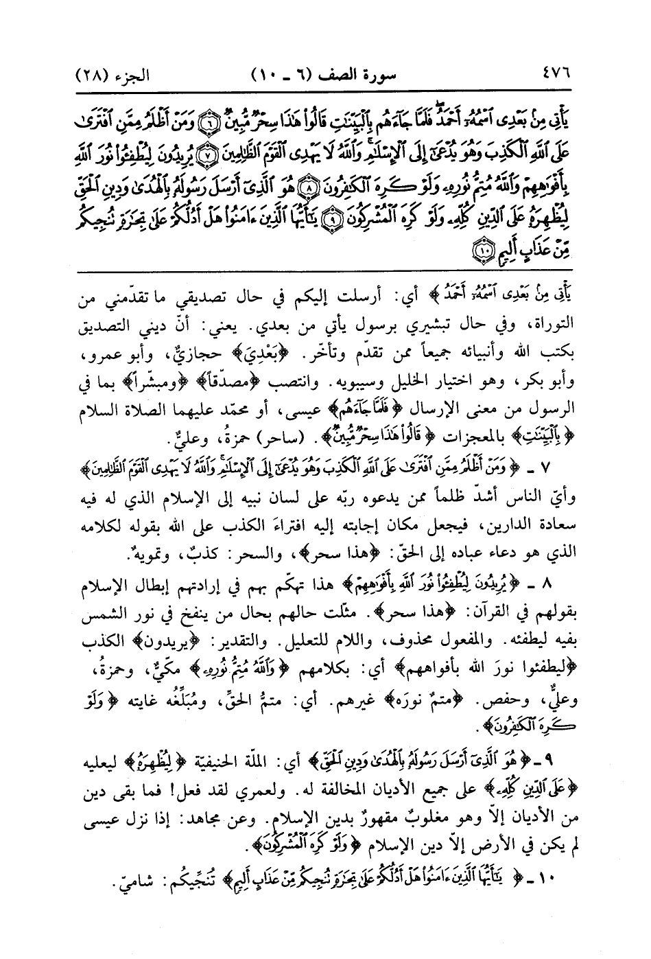 يَأْتِى مِن بَعْدِى اسمه أَحْمَدُ} أي أرسلت إليكم في حال تصديقي ما تقدمني من التوراة وفي حالٍ تبشيري برسول يأتي من بعدي يعني ان دين اتصديق بكتب الله وأنبيائه جميعاً ممن تقدم وتأخر بَعْدِى حجازي وأبو عمرو وأبو بكر وهو اختبار الخليل وسيبويه وانتصب مصدقا ومبشرا بما في الرسول من معنى الإِرسال {فَلَمَّا جَآءَهُمُ} عيسى أو محمد عليهما السلام {بالبينات} بالمعجزات {قَالُواْ هذا سِحْرٌ مُّبِينٌ} ساحر حمزة وعلى