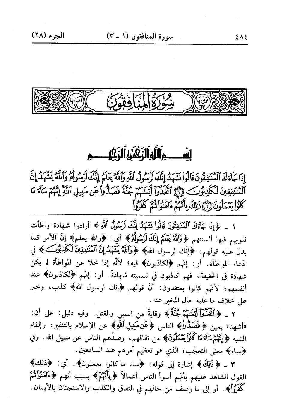 إِذَا جَاءَكَ الْمُنَافِقُونَ قَالُوا نَشْهَدُ إِنَّكَ لَرَسُولُ اللَّهِ وَاللَّهُ يَعْلَمُ إِنَّكَ لَرَسُولُهُ وَاللَّهُ يَشْهَدُ إِنَّ الْمُنَافِقِينَ لَكَاذِبُونَ (1)