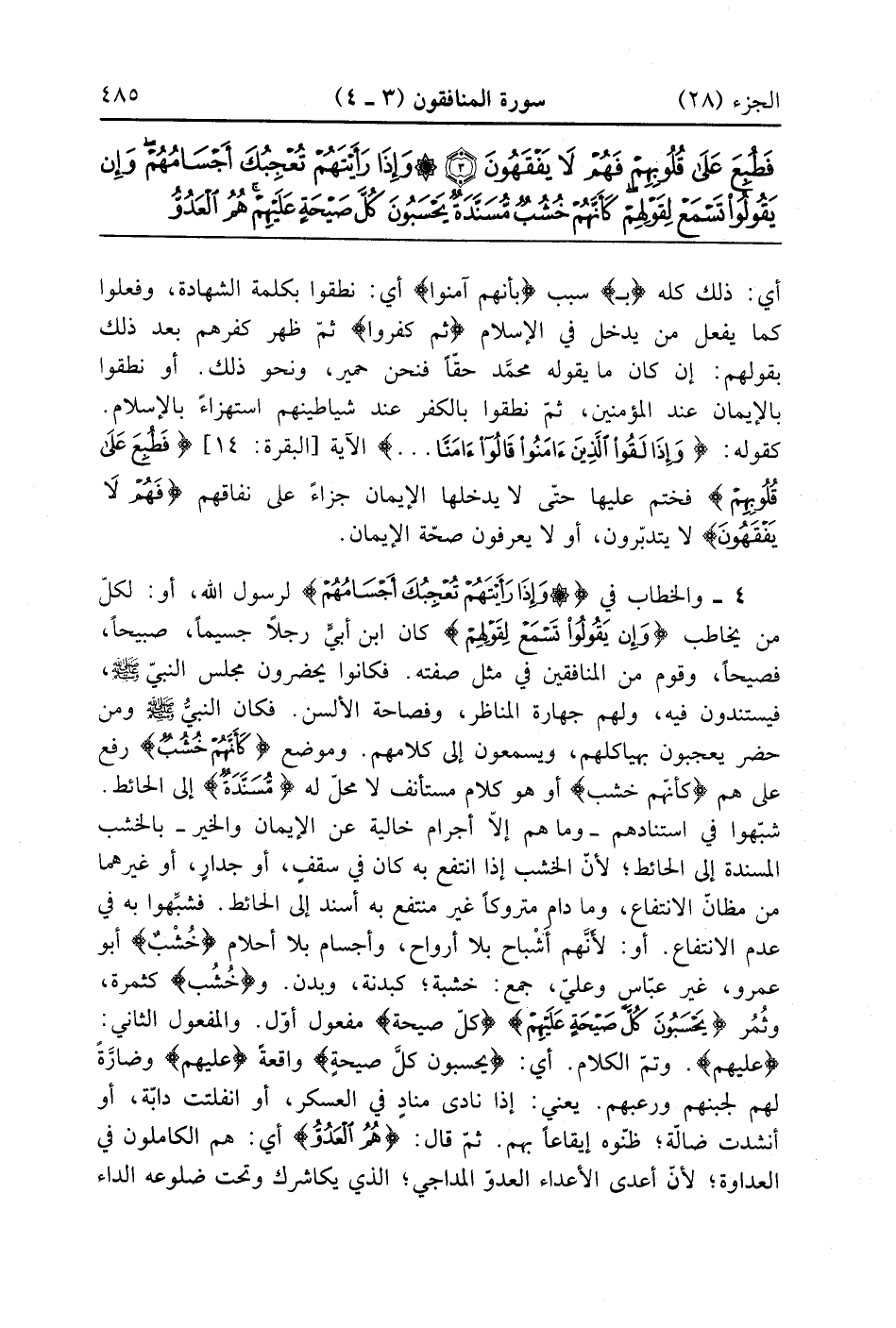 وَإِذَا رَأَيْتَهُمْ تُعْجِبُكَ أَجْسَامُهُمْ وَإِنْ يَقُولُوا تَسْمَعْ لِقَوْلِهِمْ كَأَنَّهُمْ خُشُبٌ مُسَنَّدَةٌ يَحْسَبُونَ كُلَّ صَيْحَةٍ عَلَيْهِمْ هُمُ الْعَدُوُّ فَاحْذَرْهُمْ قَاتَلَهُمُ اللَّهُ أَنَّى يُؤْفَكُونَ (4)