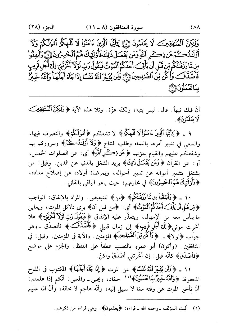 وَأَنْفِقُوا مِنْ مَا رَزَقْنَاكُمْ مِنْ قَبْلِ أَنْ يَأْتِيَ أَحَدَكُمُ الْمَوْتُ فَيَقُولَ رَبِّ لَوْلَا أَخَّرْتَنِي إِلَى أَجَلٍ قَرِيبٍ فَأَصَّدَّقَ وَأَكُنْ مِنَ الصَّالِحِينَ (10)