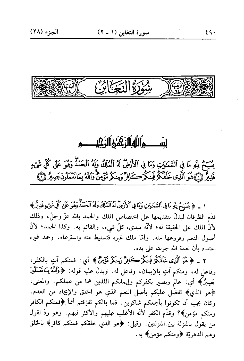 يُسَبِّحُ لِلَّهِ مَا فِي السَّمَاوَاتِ وَمَا فِي الْأَرْضِ لَهُ الْمُلْكُ وَلَهُ الْحَمْدُ وَهُوَ عَلَى كُلِّ شَيْءٍ قَدِيرٌ (1)