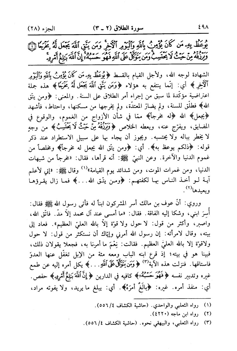 {وَيَرْزُقْهُ مِنْ حَيْثُ لاَ يَحْتَسِبُ} من وجه لا يخطر بباله ولا يحتسبه ويجوز أن يجاء بها على سبيل الاستطراد عند ذكر قوله ذلك يُوعَظُ بِهِ أي ومن يتق الله يجعل له مخرجاً ومخلصاً من غموم الدنيا والآخرة وعن النبي صلى الله عليه وسلم أنه قرأها فقال مخرجاً من شبهات الدنيا ومن غمرات المت ومن شدائد يوم القيامة وقال صلى الله عليه وسلم إني لأعلم آية لو اخذ الناس بهم لكفتهم ومن يتق الله فما زال يقرؤها ويعيدها وروى أن عرف بن مالك أسر المشركون ابناً له فأتى رسول الله صلى الله عليه وسلم فقال أسر ابني وشكا إليه الفاقة فقال ما أمسى عند آل محمد الامد فاتق الله واصبرو وأكثر من قول لا حول ولا قوة إلا بالله العلي العظيم فعاد إلى بيته وقال لامرأته ان رسول الله أمرنيوايكاان نستكثر من قول لا حول ولا قوة إلا بالله العلي العظيم فقالت نعم ما أمرنا به فجعلا يقولان ذلك فبينما هو في بيته إذ قرع ابنه الباب ومعه مائة من الإبل تغفل عنها العدو فاستاقها فنزلت هذه الآية {وَمَن يَتَوَكَّلْ على الله} يكل أمره إليه عن طمع غيره وتدبير نفسه {فهو حسبه} كافيه من الدارين {إِنَّ الله بالغ أَمْرِهِ} حفص أي منفذ أمره غيره بالغٌ أمرَه أي يبلغ ما يريد لا يفوته مراد
