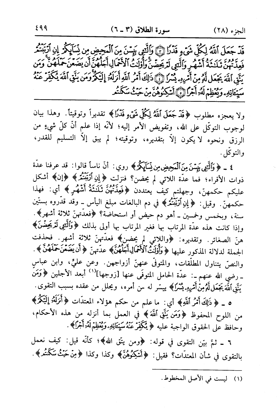 وَاللَّائِي يَئِسْنَ مِنَ الْمَحِيضِ مِنْ نِسَائِكُمْ إِنِ ارْتَبْتُمْ فَعِدَّتُهُنَّ ثَلَاثَةُ أَشْهُرٍ وَاللَّائِي لَمْ يَحِضْنَ وَأُولَاتُ الْأَحْمَالِ أَجَلُهُنَّ أَنْ يَضَعْنَ حَمْلَهُنَّ وَمَنْ يَتَّقِ اللَّهَ يَجْعَلْ لَهُ مِنْ أَمْرِهِ يُسْرًا (4)