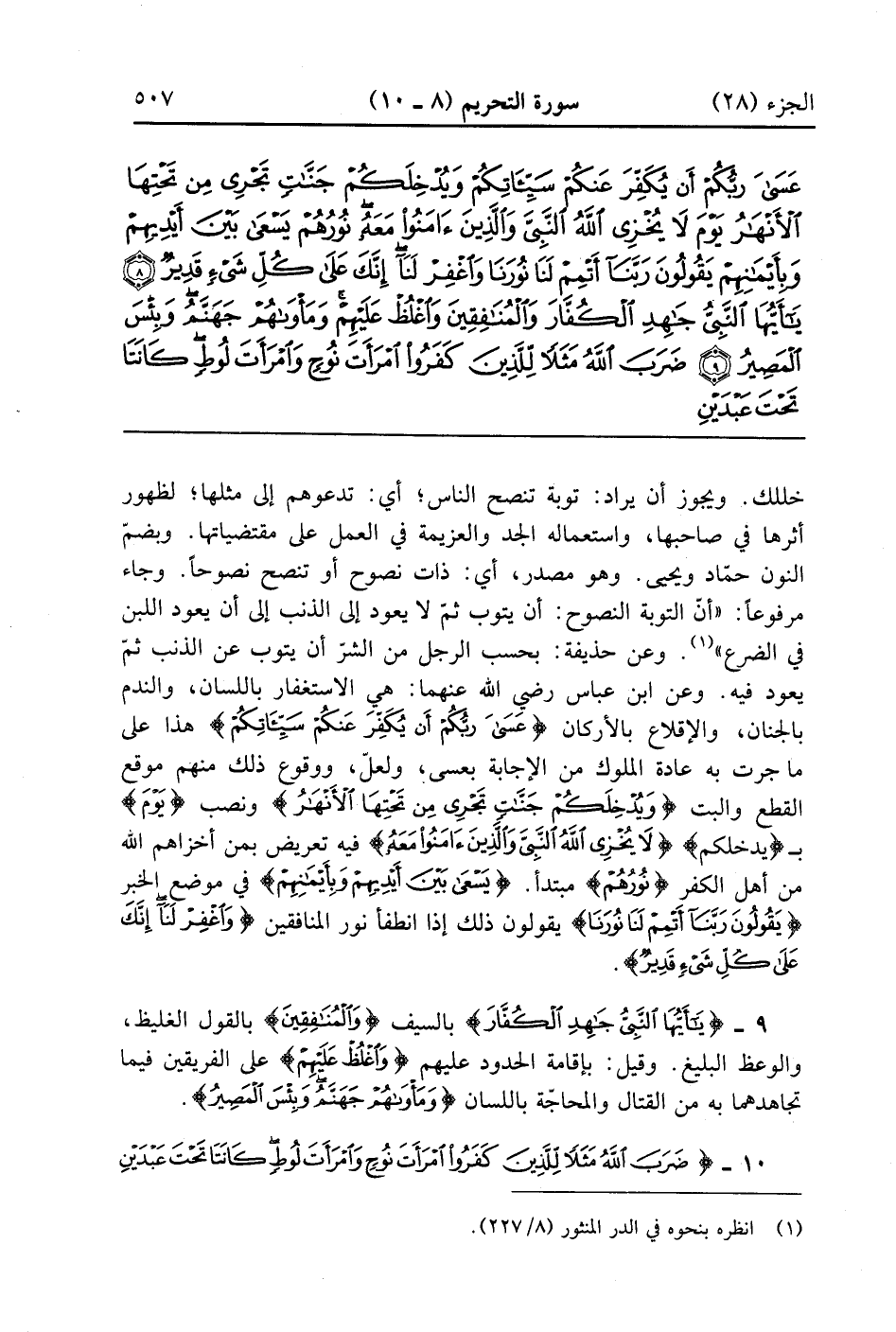 خللك ويجوز أن يراد توبة تنصح الناس أي تدعوهم إلى مثلها لظهور أثرها في صاحبها واستعماله الجد والعزيمة في العمل على مقتضياتها وبضم النون حماد ويحيى وهو مصدر أي ذات نصوح أن تنصح نصوحاً وجاء مرفوعاً إن التوبة النصوح أن يتوب ثم لا يعود إلى الذنب إلى أن يعود اللبن في الضرع وعن حذيفة بحسب الرجل من الشر أن يتوب عن الذنب ثم لا ثم لا يعود إلى الذنب إلى أن يعود اللبن في الضرع وعن حذيفة بحسب الرجل من الشر أن يتوب عن الذنب يعود فيه وعن ابن عباس رضي الله عنهما هي الاستغفار وباللسان والندم بالجنان والإقلاع بالإركان {عسى رَبُّكُمْ أَن يُكَفّرَ عَنكُمْ سيئاتكم} هذا على ما جرت به عادة الملوك من الاجابة بعسى ولعل ووقوع ذلك منهم موقع القطع والبت {وَيُدْخِلْكُمْ جنات تَجْرِى مِن تَحْتِهَا الأنهار} ونصب {يَوْمَ} يدخلكم {لا يخزي الله النبي والذين آمنوا مَعَهُ} فيه تعريض بمن أخزاهم الله من أهل الكفر {نُورُهُم} مبتدأ {يسعى بَيْنَ أَيْدِيهِمْ وبأيمانهم} في موضع الخبر {يَقُولُونَ رَبَّنَا أَتْمِمْ لَنَا نُورَنَا} يقولون ذلك إذا انطفأ نور المنافقين {واغفر لَنَا إِنَّكَ على كُلّ شَىْء قدير}