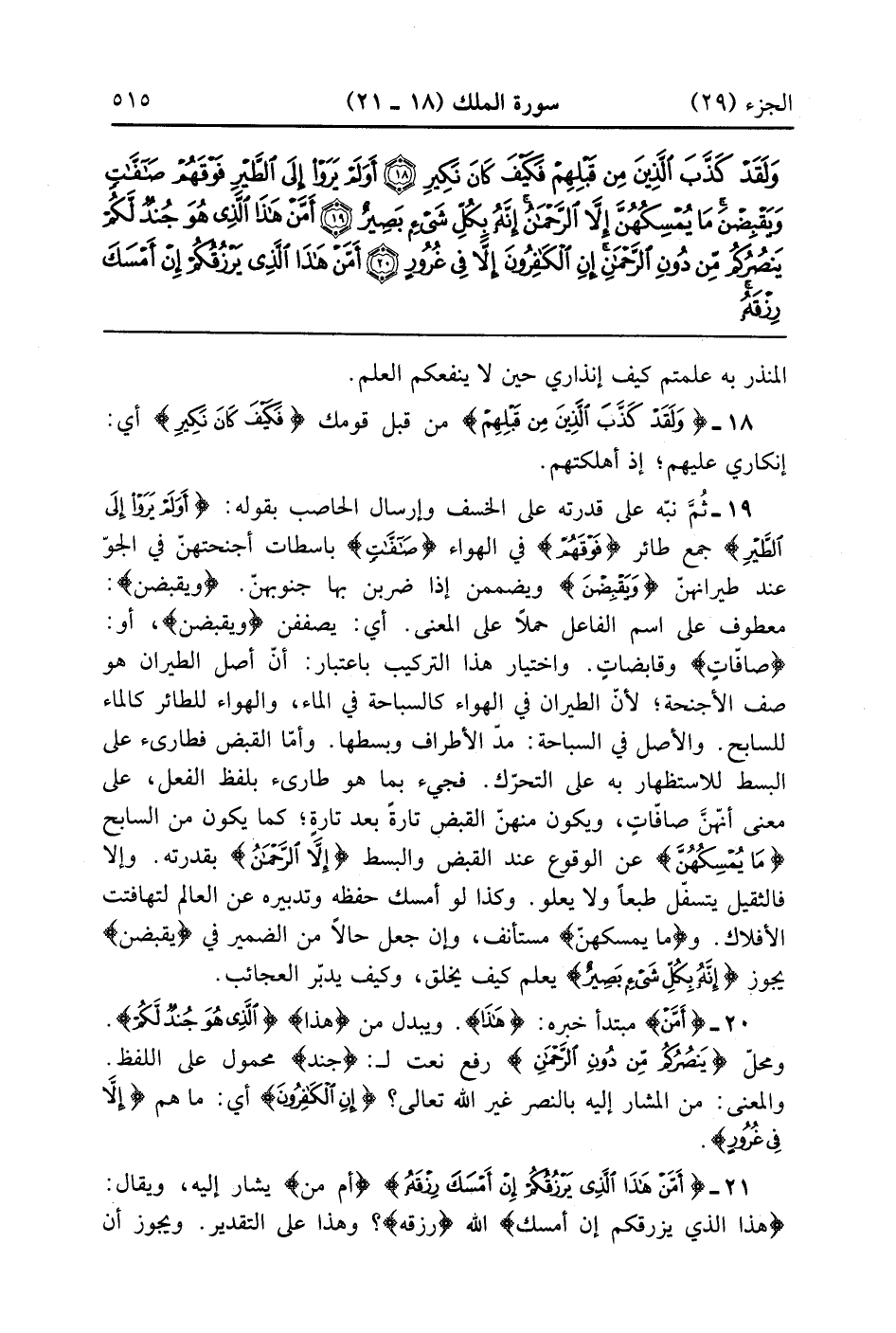 أَوَلَمْ يَرَوْا إِلَى الطَّيْرِ فَوْقَهُمْ صَافَّاتٍ وَيَقْبِضْنَ مَا يُمْسِكُهُنَّ إِلَّا الرَّحْمَنُ إِنَّهُ بِكُلِّ شَيْءٍ بَصِيرٌ (19)
