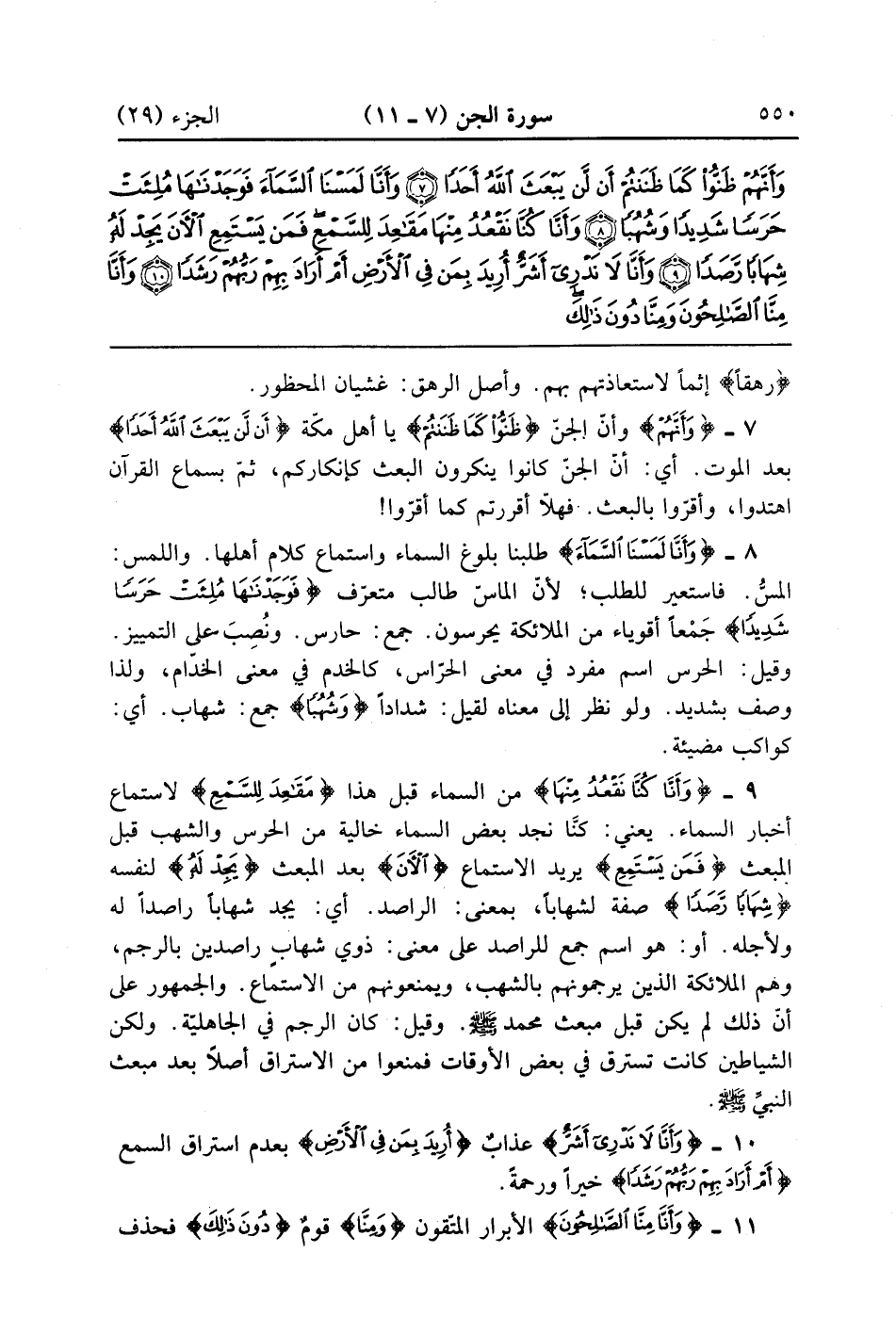 {وَأَنَّا كُنَّا نَقْعُدُ مِنْهَا} من السماء قبل هذا {مقاعد للسمع} لاستمع أخبار السماء يعني كنا نجد بعض السماء خالية من الحرس والشهب قبل المبعث {فَمَن يَسْتَمِعِ} يرد الاستماع {الآن} بعد المبعث {يَجِدْ له} لنفسه {شهابا رصدا} صفة لشهابا بمعنى الراصد ان يجد شهاباً راصداً له ولأجله أو هو اسم جمع للراصد على معنى ذوي شهاب راصدين بالرجم وهم الملائكة الذين يرجمونهم بالشهب ويمنعونهم من الاستماع والجمهور على أن ذلك لم يكن قبل مبعث محمد صلى الله عليه وسلم وقيل كان الرجم في الجاهلية ولكن الشياطين كانت تسترق السمع في بعض الأوقات فمنعوا من الاستراق أصلا بعد مبعث النبي صلى الله عليه وسلم