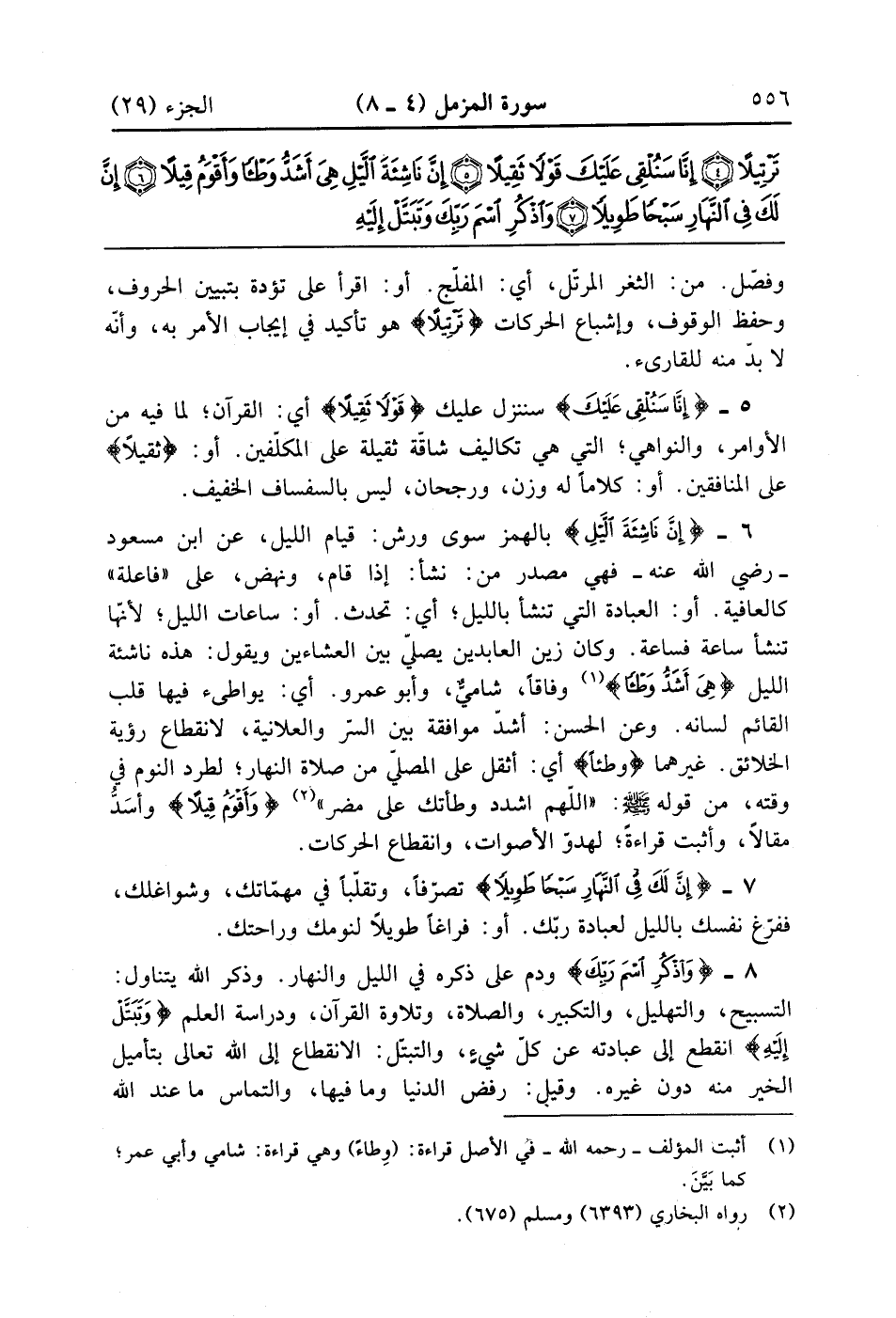 {إن ناشئة الليل} بالهمزة سوى ورش قيام الليل عن ابن مسعود رضي الله عنه فهو مصدر من نشأ إذا قام ونهض على فاعلة كالعافية أو العبادة التي تنشأ بالليل أي تحدث أو ساعات الليل لأنها تنشأ ساعة فساعة وكان زيد العابدين رضي الله عنه يصلي بين العشاءين ويقول هذه نائشة الليل {هي أشد وطأ} وفاقا شامي وابو عمرو وأي يواطئ فيها قلب القائم لسانه وعن الحسن أشد موافقة بين السر والعلانية لانقطاع رؤية الخلائق غيرهما وَطْأ أي أثقل على المصلي من صلاة النهار لطرد النوم في وقته من قوله صلى الله عليه وسلم اللهم اشدد وطأتك على مضر {وَأَقْوَمُ قِيلاً}