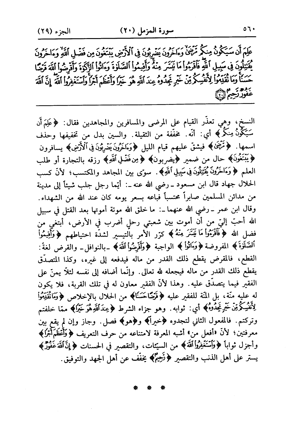النسخ وهي تعذر القيام على المرضى والمسافرين والمجاهدين فقال {عَلِمَ أَن سَيَكُونُ مِنكُمْ} أي أنه مخففة من الثقيلة والسين بدل من تخفيفها وحذف اسمها {مرضى} فيشق عليهم قيام الليل {وآخرون يَضْرِبُونَ فِى الأرض} يسافرون {يَبْتَغُونَ} حال من ضمير يَضْرِبُونَ {مِن فَضْلِ الله} رزقه بالتجارة أو طلب العلم {وآخرون يقاتلون فِى سَبِيلِ الله} سوّى بين المجاهد والمكتسب لأن كسب الحلال جهاد قال ابن مسعود رضي الله عنه ايما رجل جلب شيئا إلى المدينة من مدائن المسلمين صابراً محتسباً فباعه بسعر يومه كان عند الله من الشهداء وقال ابن عمر رضي الله عنهما ماخلق الله موتة أموتها بعد القتل في سبيل الله أحب إليّ من أن أموت بين شعبتي رجل أضرب في الأرض أبتغي من فضل الله {فاقرؤوا ما تيسر من} كرر الأمر بالتيسير لشدة احتياطهم {وأقيموا الصلاة} المفروضة {وآتوا الزكاة} الواجبة {وَأَقْرِضُواُ الله} بالنوافل والقرض لغة القطع فالمقرض بقطع ذلك القدر من ماله فيدفعه إلى غيره وكذا المتصدق يقطع ذلك القدر من ماله فيجعله الله تعالى وإنما أضافه إلى نفسه لئلا يمن على الفقير فيما يتصدق به عليه وهذا لأن الفقير معاون له في تلك القربة فلا يكون له عليه منه بل المة للفقير عليه {قَرْضًا حَسَنًا} من الحلال بالاخلاص {وَمَا تُقَدّمُواْ لأَنْفُسِكُم مّنْ خَيْرٍ تَجِدُوهُ} أي ثوابه وهو جواب الشرط {عِندَ الله هُوَ خَيْراً} مما خلفتم وتركتم فالمفعول الثاني لتجدوه خيرا وهو فصل وجاز وإن لم يقع بين معرفتين لأن أفعل ما أشبه المعرفة لامتناعه من حرف التعريف وَأَعْظَمَ أجرا وأجزل ثوابا واستغفروا من السيآت والتقصير في الحسنات {إِنَّ الله غَفُورٌ} يستر على أهل الذنب والتقصير {رَّحِيمٌ} يخفف عن أهل الجهد والتوفير وهو على ما يشاء قدير والله أعلم