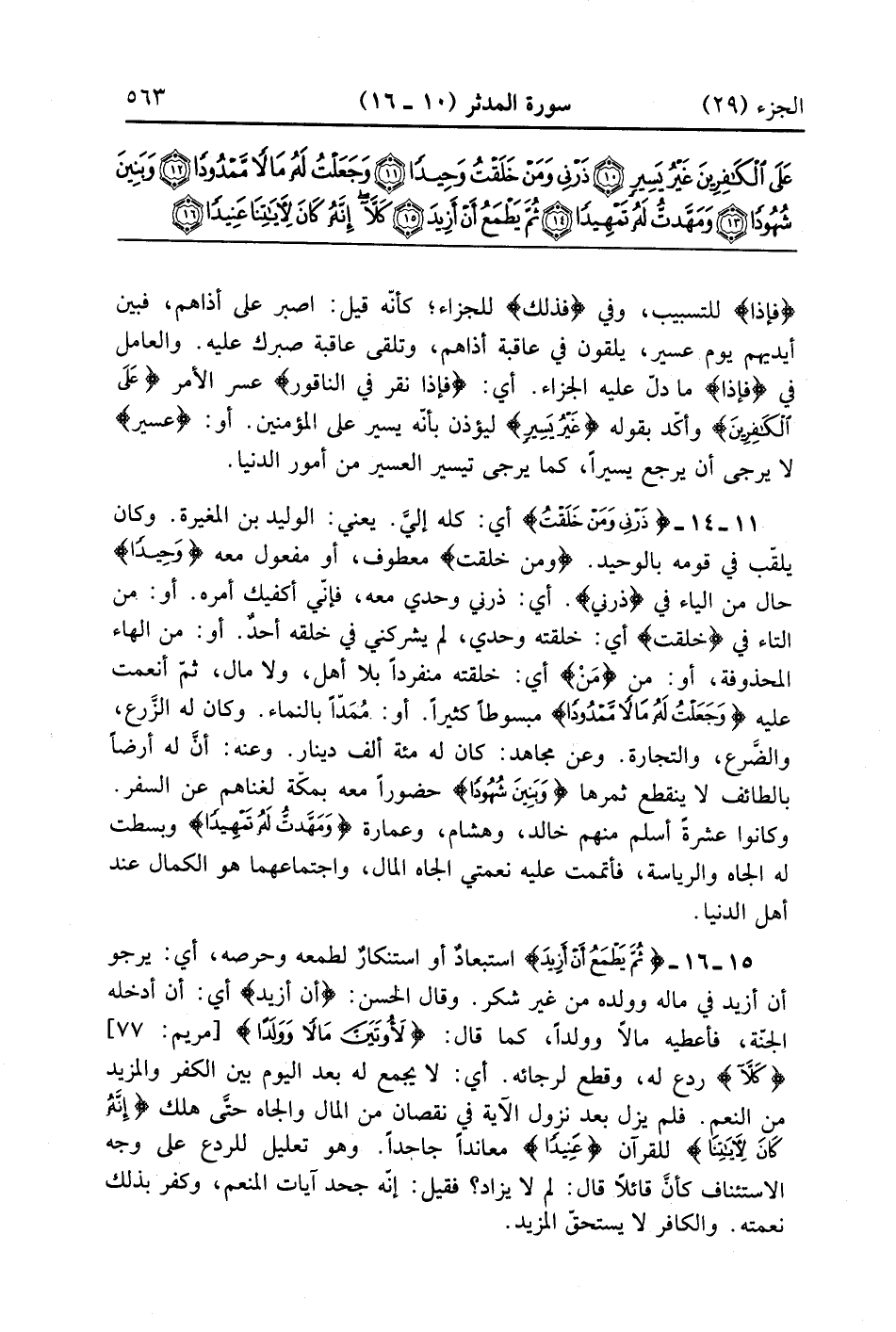 {ذرني ومن خلقت} أي كله إلى عيني الوليد بن المغيرة وكان يلقب في قومه بالوحيد ومن خلقت معطوف أو مفعول معه {وَحِيداً} حال من الياء في ذرني أي اترني وحدي معه فإني أكفيك أمره أو من التاء في خلقت أي خلقته وحدي لم يشركني في خلقه