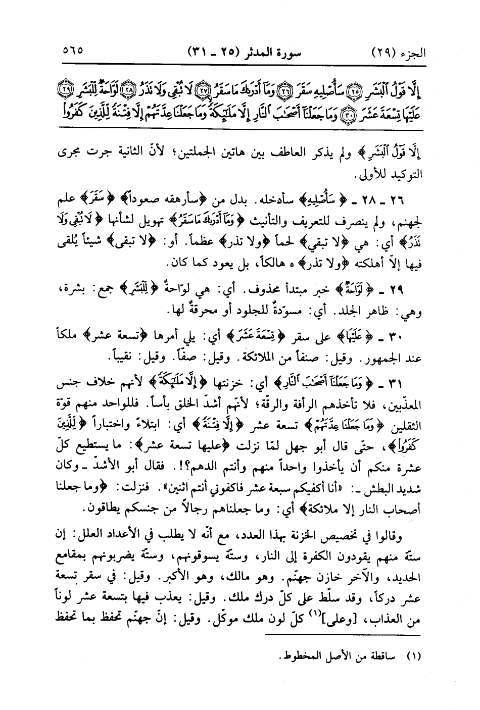 وَمَا جَعَلْنَا أَصْحَابَ النَّارِ إِلَّا مَلَائِكَةً وَمَا جَعَلْنَا عِدَّتَهُمْ إِلَّا فِتْنَةً لِلَّذِينَ كَفَرُوا لِيَسْتَيْقِنَ الَّذِينَ أُوتُوا الْكِتَابَ وَيَزْدَادَ الَّذِينَ آمَنُوا إِيمَانًا وَلَا يَرْتَابَ الَّذِينَ أُوتُوا الْكِتَابَ وَالْمُؤْمِنُونَ وَلِيَقُولَ الَّذِينَ فِي قُلُوبِهِمْ مَرَضٌ وَالْكَافِرُونَ مَاذَا أَرَادَ اللَّهُ بِهَذَا مَثَلًا كَذَلِكَ يُضِلُّ اللَّهُ مَنْ يَشَاءُ وَيَهْدِي مَنْ يَشَاءُ وَمَا يَعْلَمُ جُنُودَ رَبِّكَ إِلَّا هُوَ وَمَا هِيَ إِلَّا ذِكْرَى لِلْبَشَرِ (31)