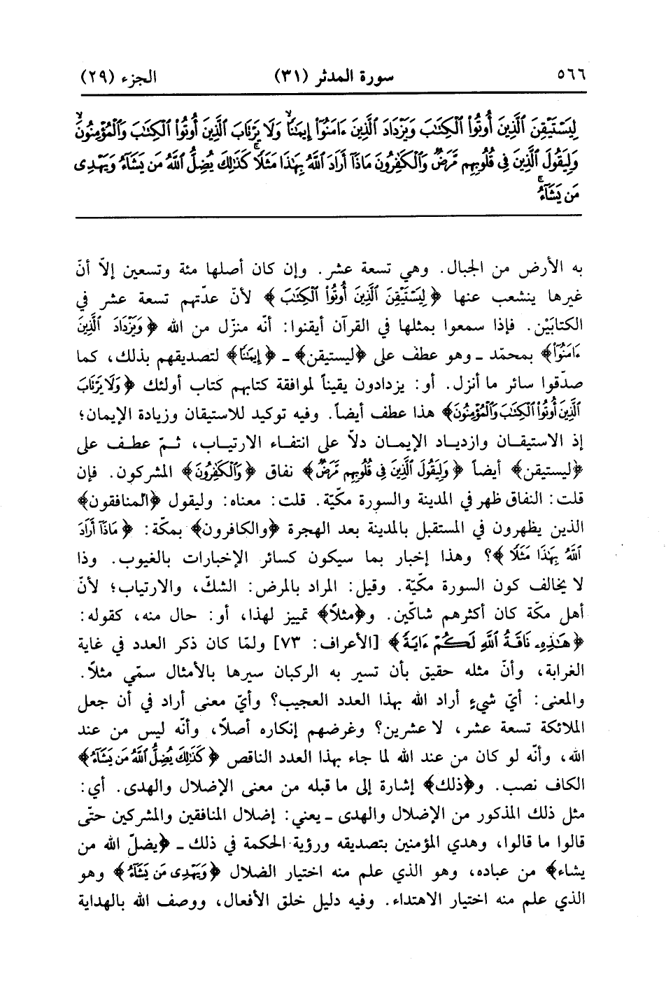 به الأرض من الجبال وهي تسعة عشر وكان أصلها مائة وتسعين إلا أن غيرها يشعب عنها {لِيَسْتَيْقِنَ الذين أُوتُواْ الكتاب} لأن عدتهم تسعة عشر في الكتابين فإذا سمعوا بمثلها في القرآن أيقنوا أنه منزل من الله {ويزداد الذين آمنوا} بمحمد وهو عطف على لِيَسْتَيْقِنَ {إيمانا} لتصديقهم بذلك كما صدقوا سائر ما أنزل أو يزدادوا يقيناً لموافقة كتابهم كتاب أولئك {وَلاَ يَرْتَابَ الذين أُوتُواْ الكتاب والمؤمنون} هذا عطف أيضاً وفيه توكيد للاستيقان وزيادة الإيمان إذ الاستيقان وازدياد الإيمان دالان على انتفاء الارتياب ثم عطف على لِيَسْتَيْقِنَ أيضاً {وَلِيَقُولَ الذين في قلوبهم مرض} نفاق {والكافرون} والمشركون فإن قلت النفاق ظهر في المدينة والسورة مكية قلت معناه وليقول المنافقون الذين يظهرون في المستقبل بالمدينة بعد الهجرة والكافرون بمكة {مَاذَا أَرَادَ الله بهذا مَثَلاً} وهذا إخبار بما سيكون