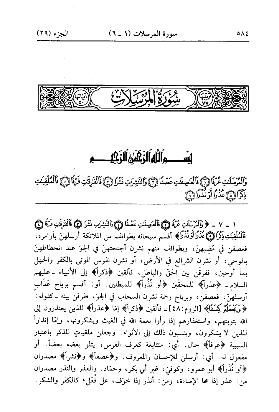 وَالْمُرْسَلَاتِ عُرْفًا (1) فَالْعَاصِفَاتِ عَصْفًا (2) وَالنَّاشِرَاتِ نَشْرًا (3) فَالْفَارِقَاتِ فَرْقًا (4) فَالْمُلْقِيَاتِ ذِكْرًا (5) عُذْرًا أَوْ نُذْرًا (6)