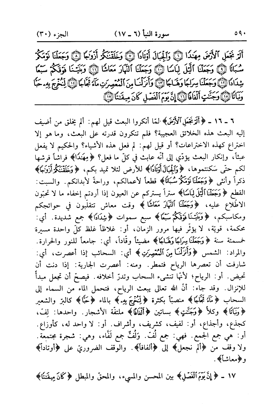 {وجنات} بساتين {أَلْفَافاً} ملتفة الأشجار واحدها لف كجذع وأجذاع ولفيف كشريف وأشراف أولا واحد له كأوزاع أو هي جمع الجمع فهي جمع لف واللف جمع لفاء وهي شجرة مجتمعة ولا وقف من أَلَمْ نَجْعَلِ إلى ألفافا والوقف الضروري على أوتادا معاشا