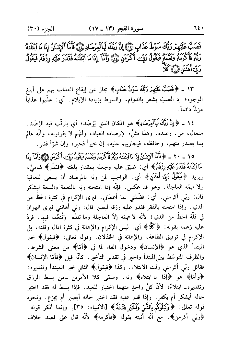 {فَأَمَّا الإنسان إِذَا مَا ابتلاه رَبُّهُ فَأَكْرَمَهُ وَنَعَّمَهُ فَيَقُولُ رَبّى أَكْرَمَنِ وَأَمَّا إِذَا مَا ابتلاه فَقَدَرَ عَلَيْهِ رِزْقَهُ} أي ضيق عليه وجعله بمقدار بلغته فَقَدَرَ شامي ويزيد {فَيَقُولُ رَبّى أَهَانَنِ} أي الواجب لمن ربه بالمرصاد أن يسعى للعاقبة ولا تهمه العاجلة وهو قد عكس فإنه إذا امتحنه ربه بالنعمة والسعة ليشكر قال ربي أكرمني أي فضلني بما أعطاني فيرى الإكرام في كثرة الحظ من الدنيا وإذا امتحنه بالفقر فقدر عليه رزقه ليصبر قال ربي أهانني فيرى الهوان في قلة الحظ من الدنيا لأنه لا تهمه إلا العاجلة وما يلذه وينعمه فيها فرد عليه زعمه بقوله