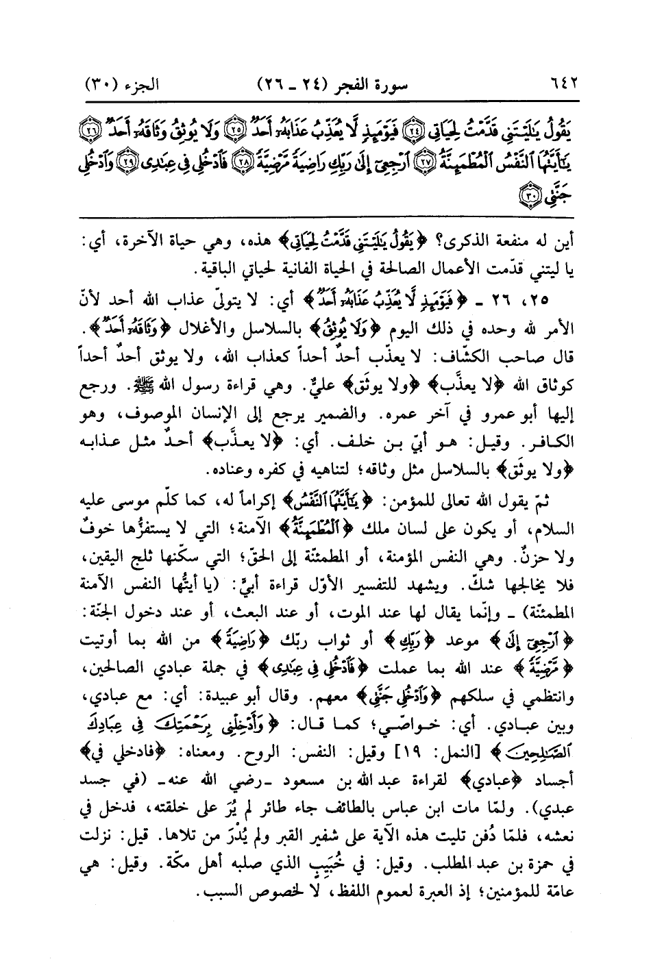 أحد أحداً كوثاق الله لاَّ يُعَذِّبُ وَلاَ يوثق على وهى قراءة رسول الله صلى الله عليه وسلم ورجع إليها أبو عمرو في آخر عمره والضمير يرجع إلى الإنسان الموصوف وهو الكافر وقيل هو أبي بن خلف أي لا يعذب أحد مثل عذابه ولا يوثق بالسلاسل مثل وثاقه لتناهيه في كفره وعناده ثم يقول الله تعالى للمؤمن