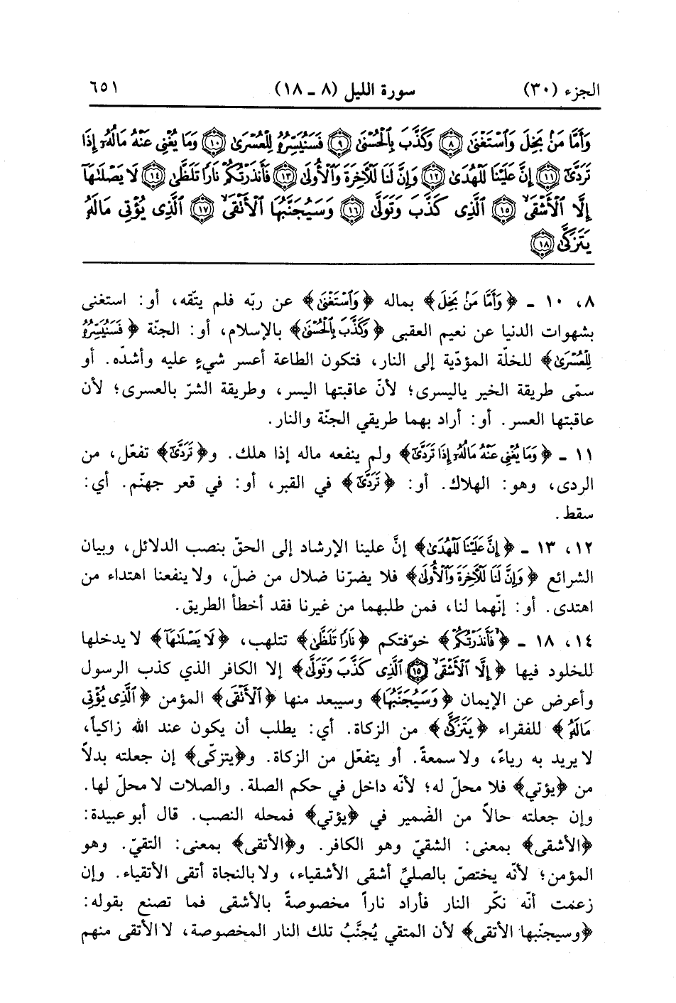 {الذي يؤتي ماله} للفقراء {يتزكى} من الزكاة أي يطلب أن يكون عند الله زاكياً لا يريد به رياء ولا سمعة أو يتفعل من الزكاة ويتزكى إن جعلته بدلاً من يؤتى فلا محل له لأنه داخل فى حكم الصلة والصلات لا محل لها وإن جعلته حالاً من الضمير في يؤتى فمحله النصب قال أبو عبيدة الأشقى بمعنى الشقي وهو الكافر والأتقى بمعنى التقى وهو المؤمن لأنه لا يختص بالمصلى أشقى الأشقياء ولا بالنجاة أتقى الأتقياء وإن زعمت أنه نكر النار فأراد ناراً مخصوصة بالأشقى فما تصنع بقوله وَسَيُجَنَّبُهَا الأتقى لأن الاتقى يجنب تلك النار المخصوصة لا الأتقى منهم