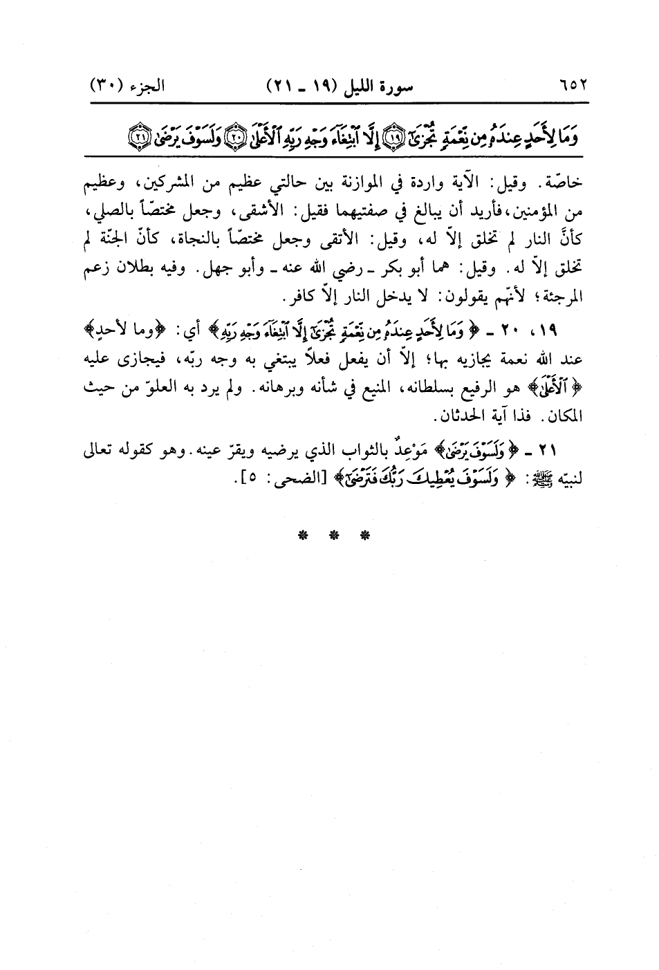 خاصة وقيل الآية واردة في الموازنة بين حالتي عظيم من المشركين وعظيم من المؤمنين فأريد أن يبالغ فى صفتيهما فقيل الأشقى وجعل مختصا بالمصلى كأن النار لم تخلق إلا له وقيل الاتقى وجعل مختصا بالنجاة كأن الحنة لم تخلق إلا له وقيل هما أبو جهل وأبو بكر وفيه بطلان زعم المرجئة لأنهم يقولون لا يدخل النار إلا كافر