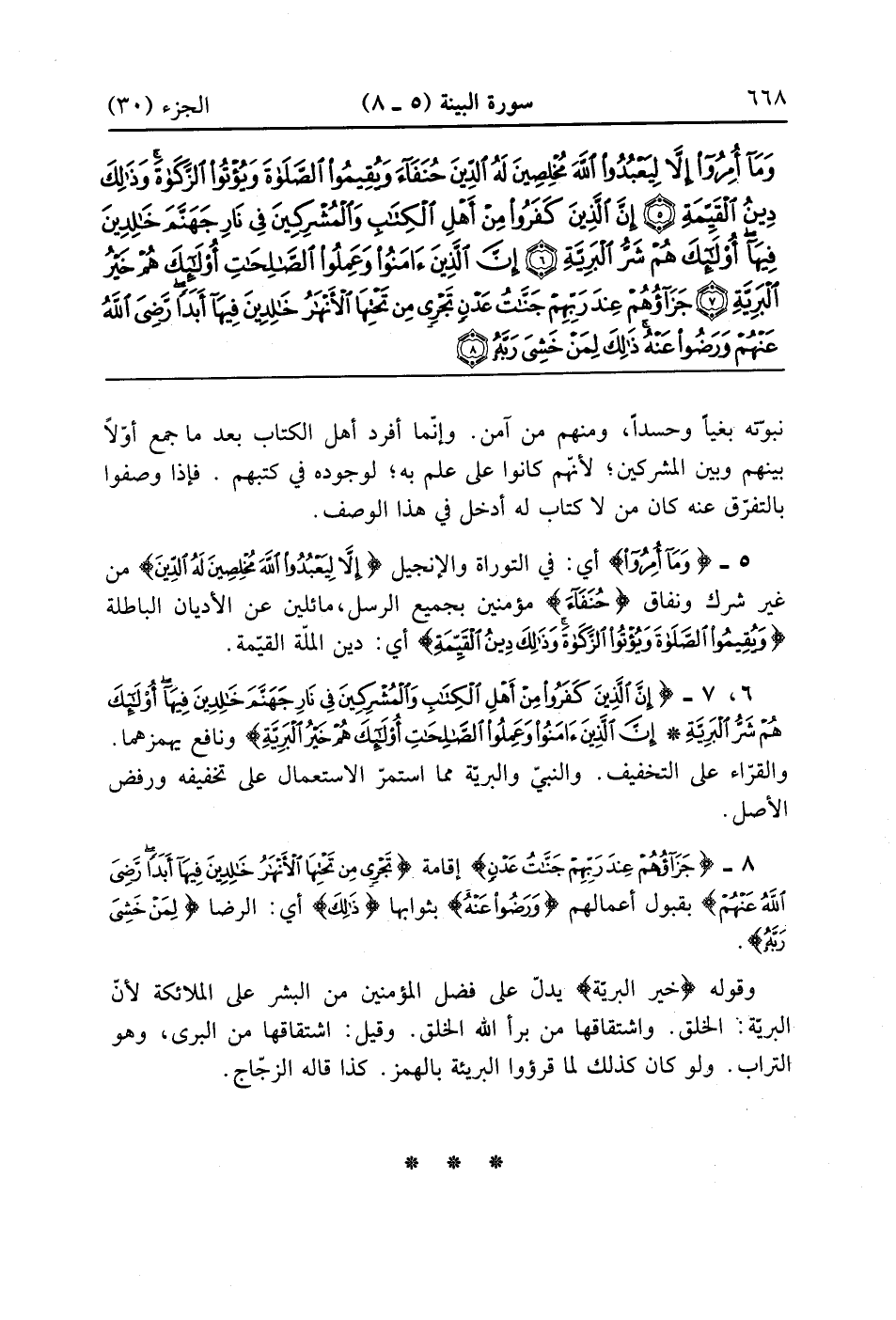 إِنَّ الَّذِينَ كَفَرُوا مِنْ أَهْلِ الْكِتَابِ وَالْمُشْرِكِينَ فِي نَارِ جَهَنَّمَ خَالِدِينَ فِيهَا أُولَئِكَ هُمْ شَرُّ الْبَرِيَّةِ (6) إِنَّ الَّذِينَ آمَنُوا وَعَمِلُوا الصَّالِحَاتِ أُولَئِكَ هُمْ خَيْرُ الْبَرِيَّةِ (7)
