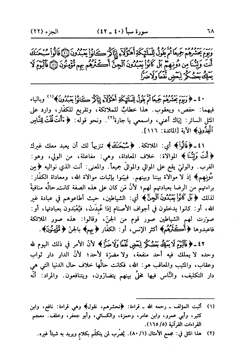 {وَيَوْمَ يَحْشُرُهُمْ جَمِيعاً ثُمَّ يَقُولُ للملائكة أَهَؤُلاَءِ إِيَّاكُمْ كَانُواْ يَعْبُدُونَ} وبالياء فيهما حفص ويعقوب هذا خطاب للملائكة وتقريع للكفار وارد على المثل السائر ... إياك أعني واسمعي يا جاره ...