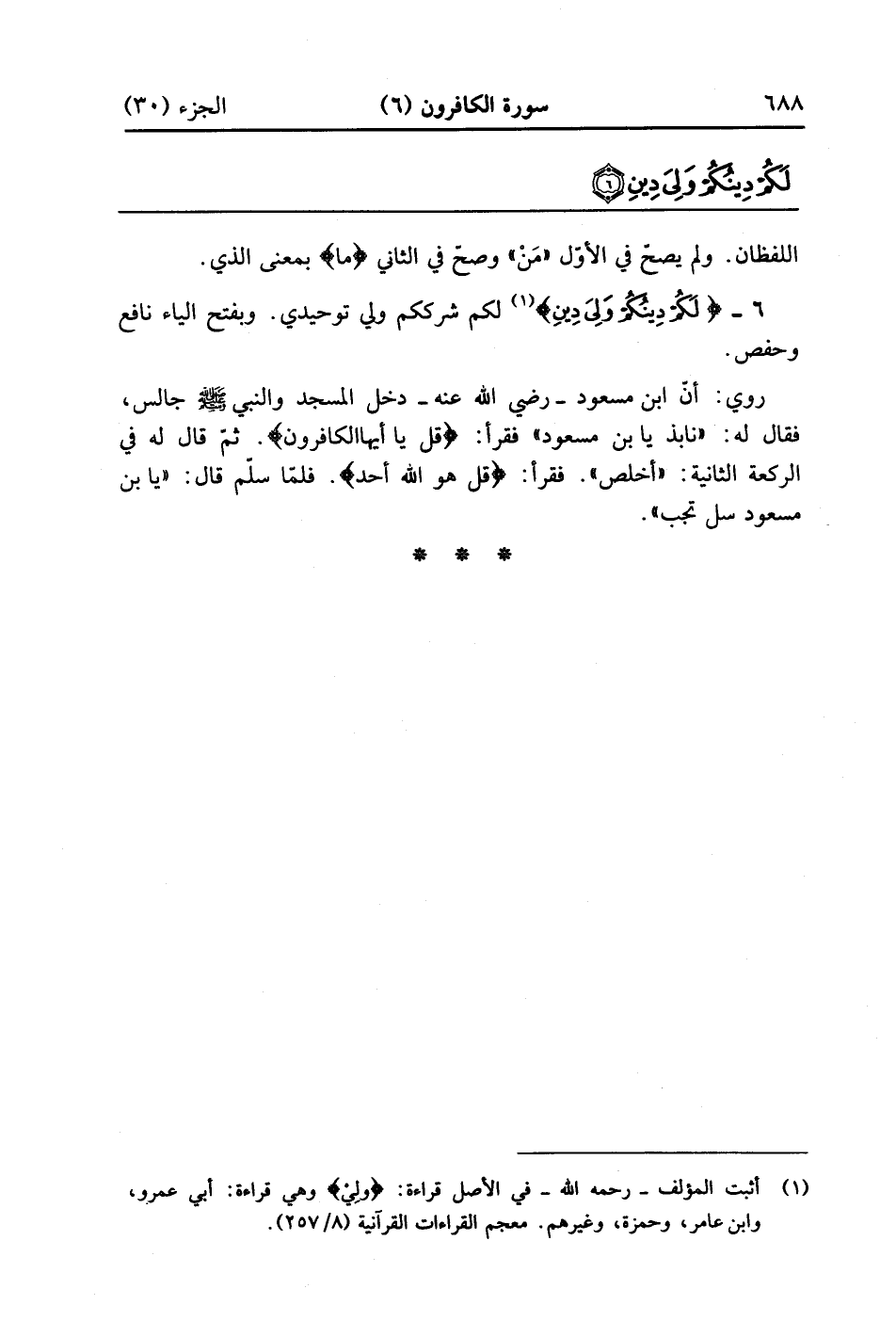 {لَكُمْ دِينُكُمْ وَلِىَ دِينِ} لكم شرككم ولي توحيدي وبفتح الياء نافع وحفص وروي أن ابن مسعود رضي الله عنه دخل المسجد والنبي صلى الله عليه وسلم جالس فقال له نابذيا ابن مسعود فقرا قل يا أيها الكافرون ثم قال له في الركعة الثانية أخلص فقرأ قُلْ هُوَ الله أَحَدٌ فلما سلم قال يا ابن مسعود سل تجب والله أعلم